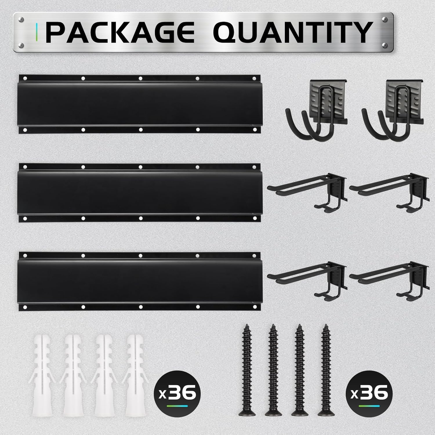 - Heavy-Duty Storage - The sturdy garage storage & organization product has a 48" long wall track with 6 hooks (4 double-layer hooks, 2 single hooks) and 3 rails that can hang a variety of tools and equipment such as shovels, brooms, rakes, power tools, folding chairs, sports gear, bikes, and more.