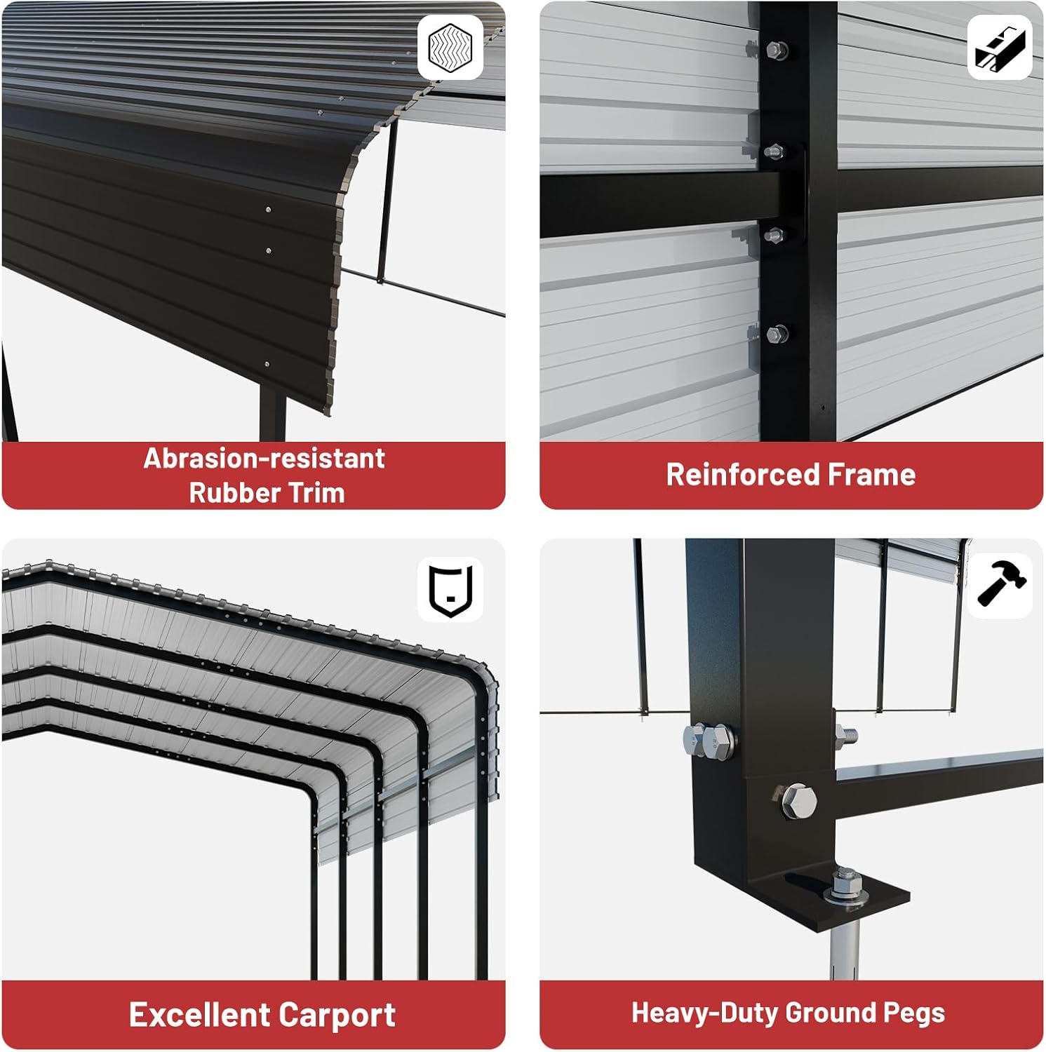 - Strong Frame Construction: The 2-inch diameter, 0.05-inch wall thickness square steel tube frame provides an exceptionally strong and stable foundation for our carport canopy. The addition of soft and abrasion-resistant rubber trim around the edge of the roof further enhances overall safety and protection from potential scratches or injuries.
