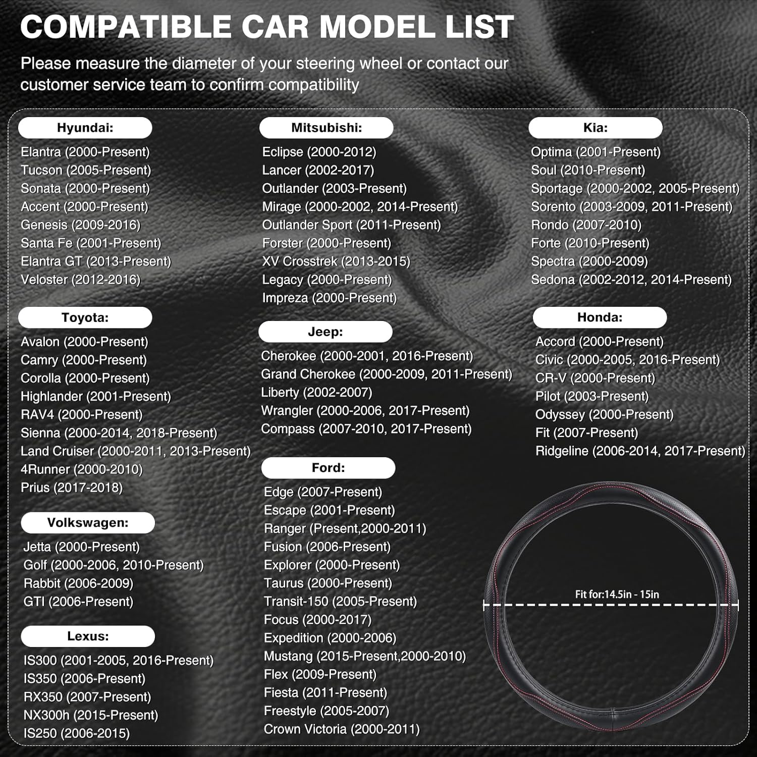 - 【Suitable Size】: Enhance the appearance and feel of your car's interior with our luxurious cowhide steering wheel cover. This steering wheel cover is designed to universally fit wheels ranging from 14.5 to 15 inches. Please measure the size of the steering wheel before purchasing.