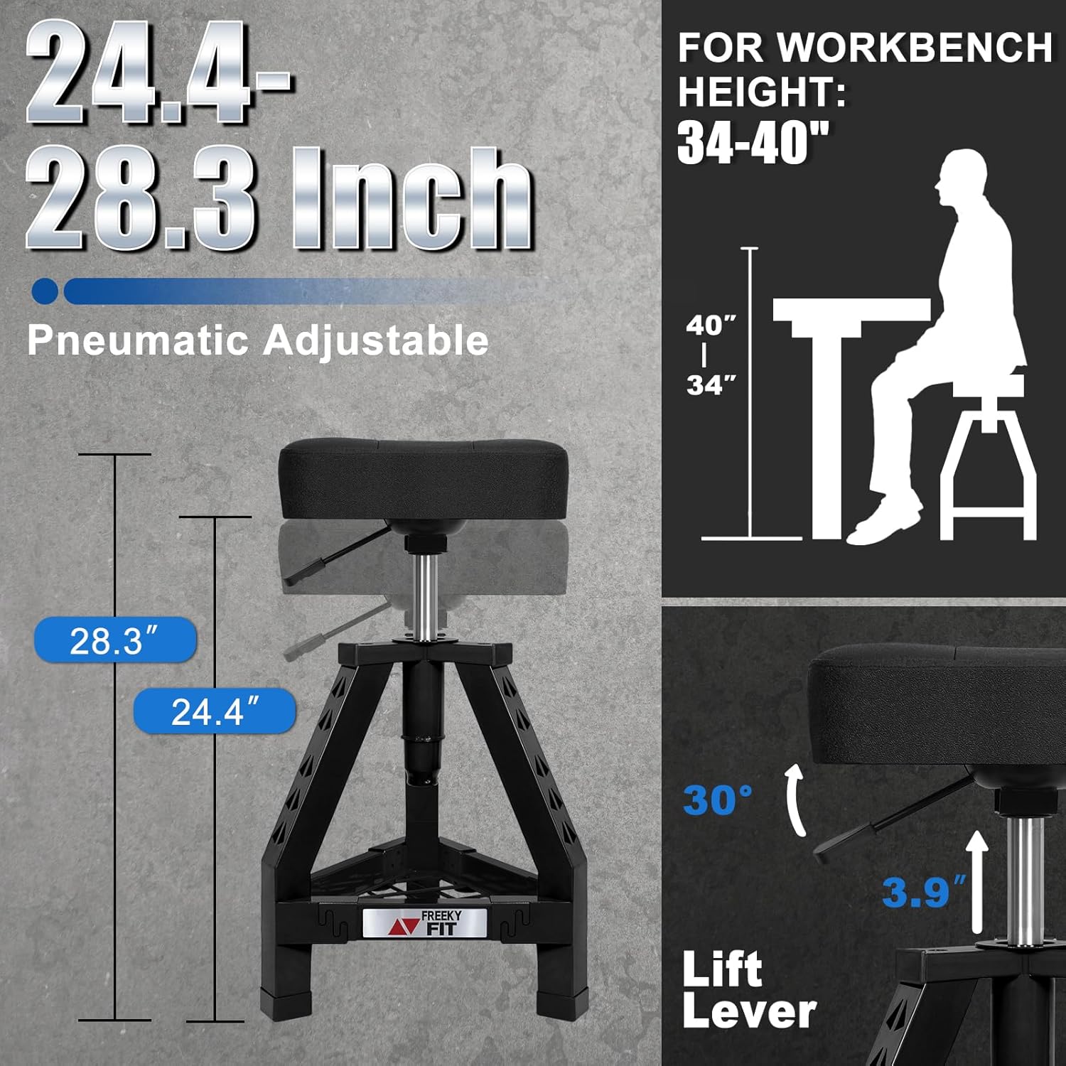Adjustable Shop Stool,Garage Mechanic Stool Chair,Work Seat for Workshop, Adjustable Height, 360° Swivel Padded Square Seat,Tool Storage, 350 LBS Capacity, Heavy Duty, Black