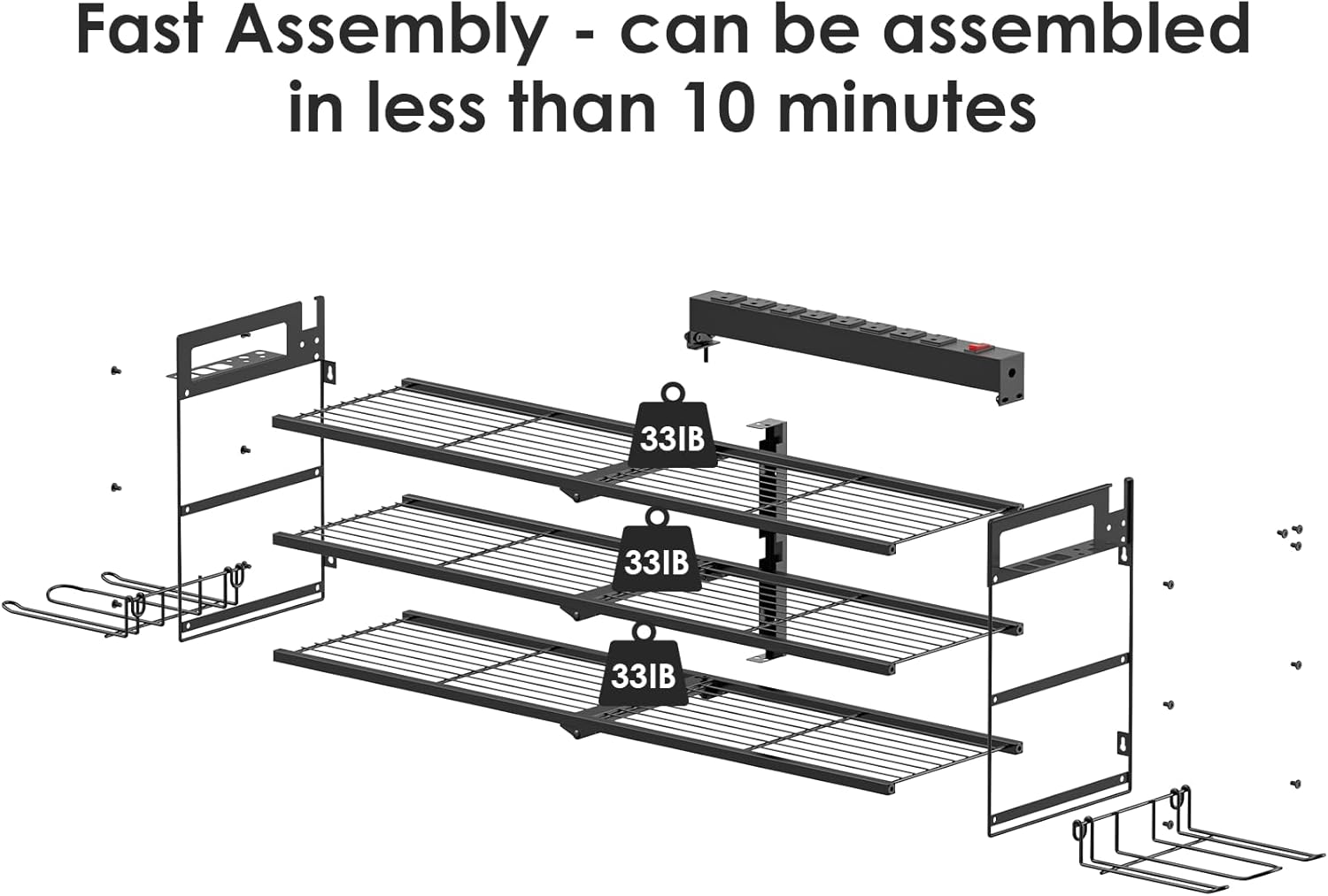 - It will be pretty useful improvement for your garage and includes double shelves, 4 drill holder, power strip, 16 storage holes designed for different size tools.