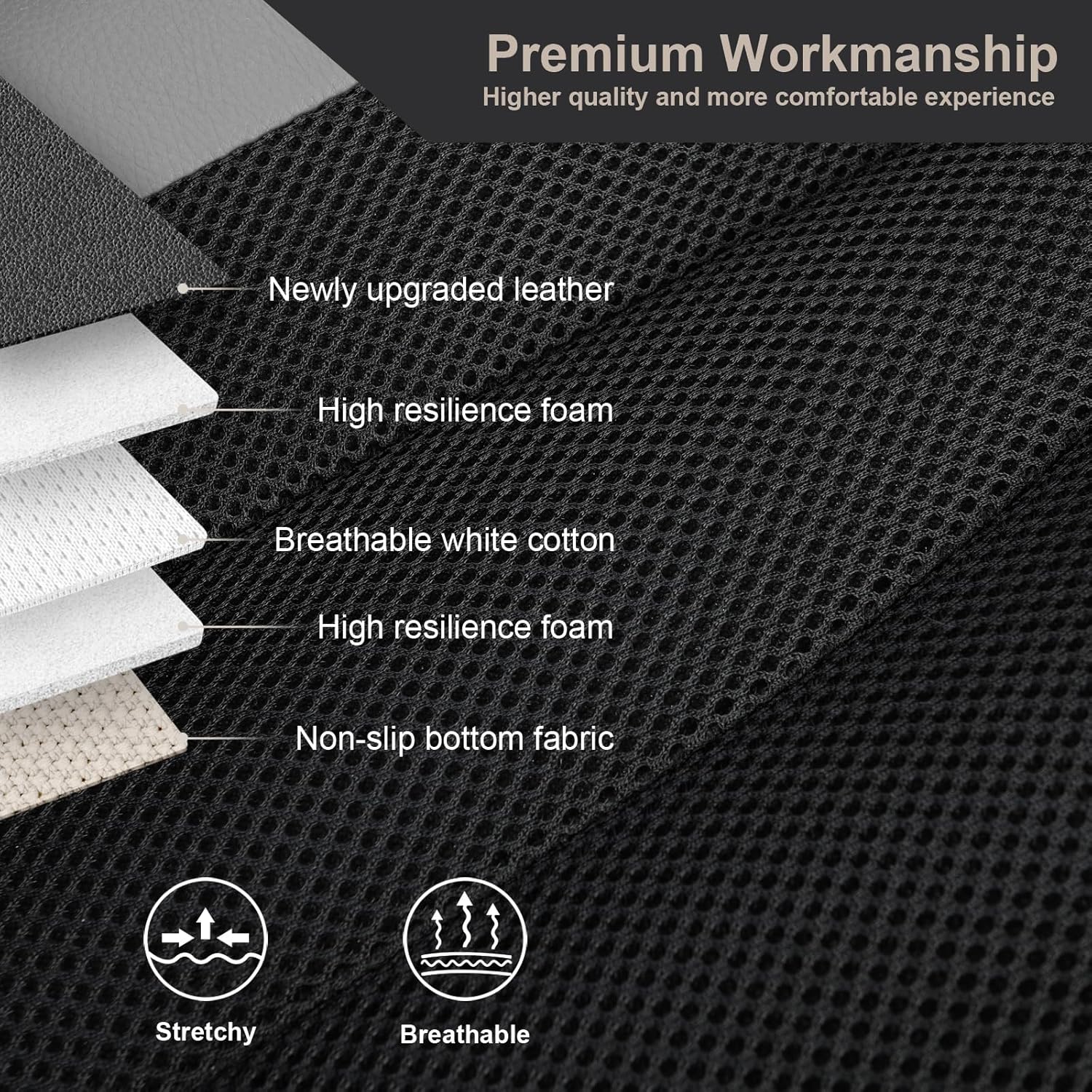 - Our car seat covers combine premium faux leather with breathable mesh fabric. The faux leather provides a luxurious look and durability, while the honeycomb mesh design on the backrest and seat ensures excellent breathability and cooling, keeping you comfortable during long drives and in hot weather.