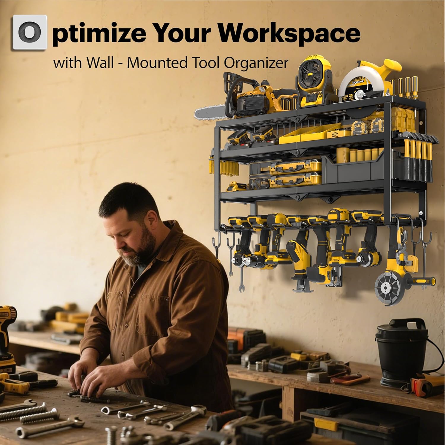 - Big-Capacity Design: This wall-mounted power tool organizer features the latest four-tier, high-capacity design. The bottom tier can accommodate 4-8 cordless drills, while the upper three tiers offer ample space for other heavy-duty tools or various small accessories. the sides are equipped with hammers, pliers, and screwdriver holders for even more versatility
