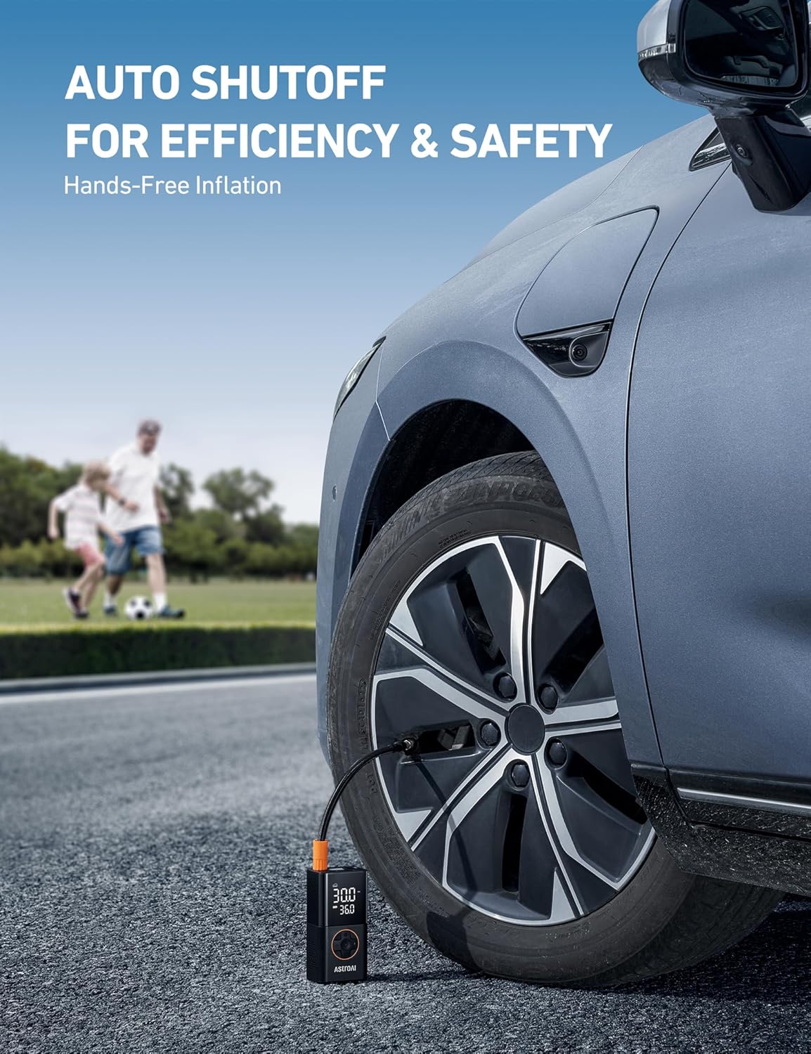 - LONG RUNTIME & AUTO-OFF: After fully charging, the built-in 4000mAh large-capacity battery allows the car tire pump to refill up to 8 tires (195/65R15) from 30-36PSI. The preset function and auto-off function deliver a hands-free inflation experience. With just one press, the cordless tire inflator will easily inflate car tires, motorcycle tires, bicycle tires, balls, and more. (Note: Incompatible with heavy-duty tires, like those on offroad vehicles, RVs, trucks, and trailers.)