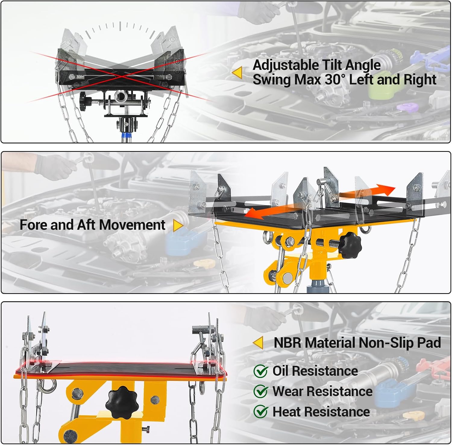 - ă33.5"-69" Adjustable Lifting Heightă- Featuring a two-stage telescoping design, our transmission jack adjusts effortlessly from 33.5 inches to 69 inches. This versatility is complemented by a convenient foot-operated pedal and a 30° tilting tray, accommodating various vehicle models and transmission sizes for optimal usability.