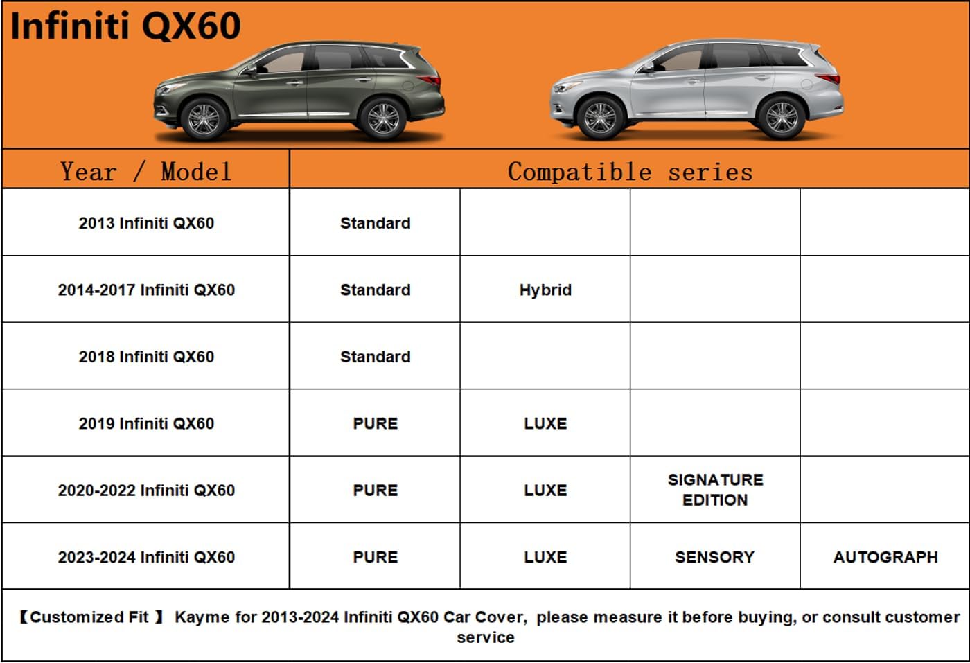 • Coverage : Full exterior coverage for Infiniti QX60 SUV (2013-2024)