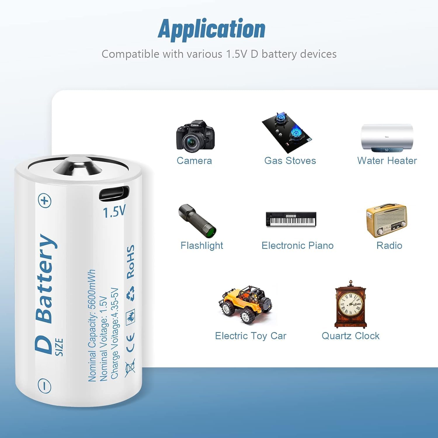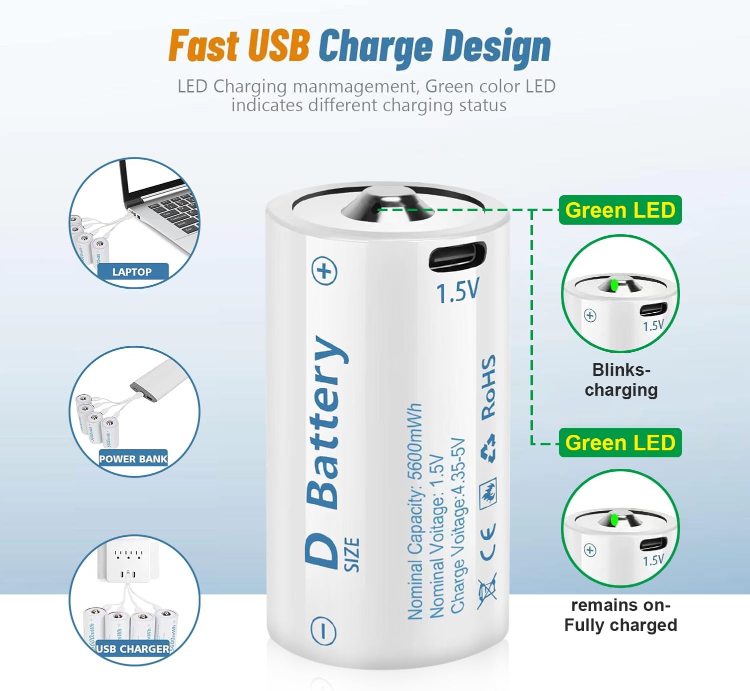 - 【USB Charge Design】1.5V D Size Cell Battery No need charger and adapter,fast full charge in about 2 hours,easy to charge with usb cable, just simply plug into USB ports