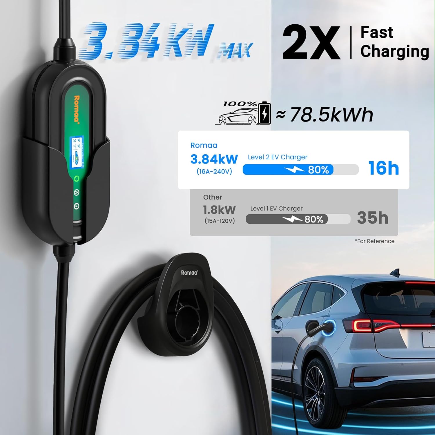 - Charge Anywhere – Level 1/2 Flexibility: The Romaa portable EV charger supports both Level 2 EV charging with nema 6-20 ev charger plug (max 3.84 kW, 240V, 16A), adding approximately 15-20 miles of range per hour, and Level 1 EV charging (max 1.76 kW, 110V, NEMA 5-15 Adapter), adding approximately 4-5 miles of range per hour; Not a fast charger — best for daily use, travel, and backup charging
