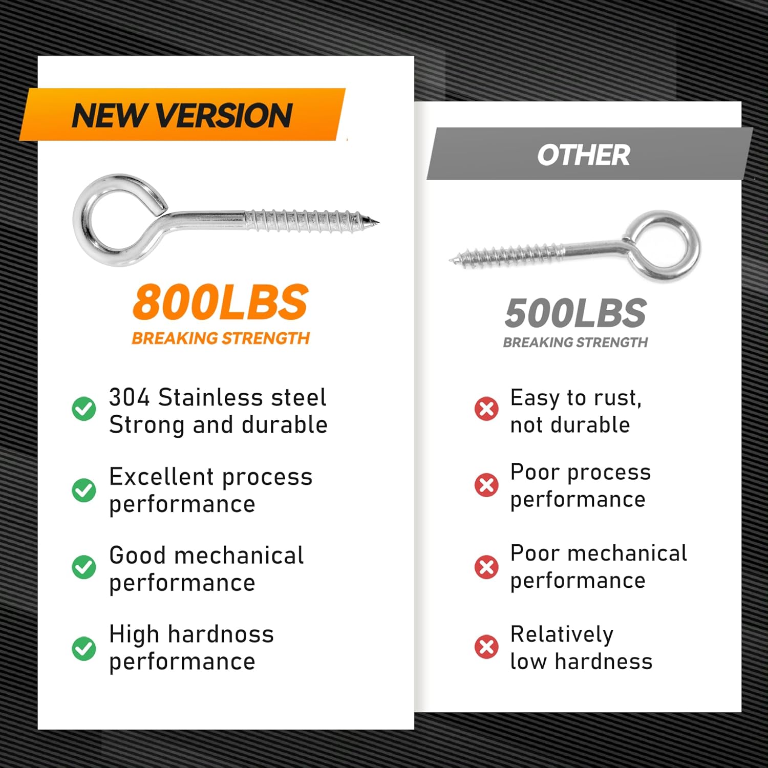 4Pcs 6 Inch Heavy Duty Screw Eyes Hooks, 304 Stainless Steel Self Tapping Eyelet Screw Eye Bolts,800LBS Breaking Strength, Screw in Eye Hooks for Wood Securing Cables Wire. (4, M10-6 Inch)