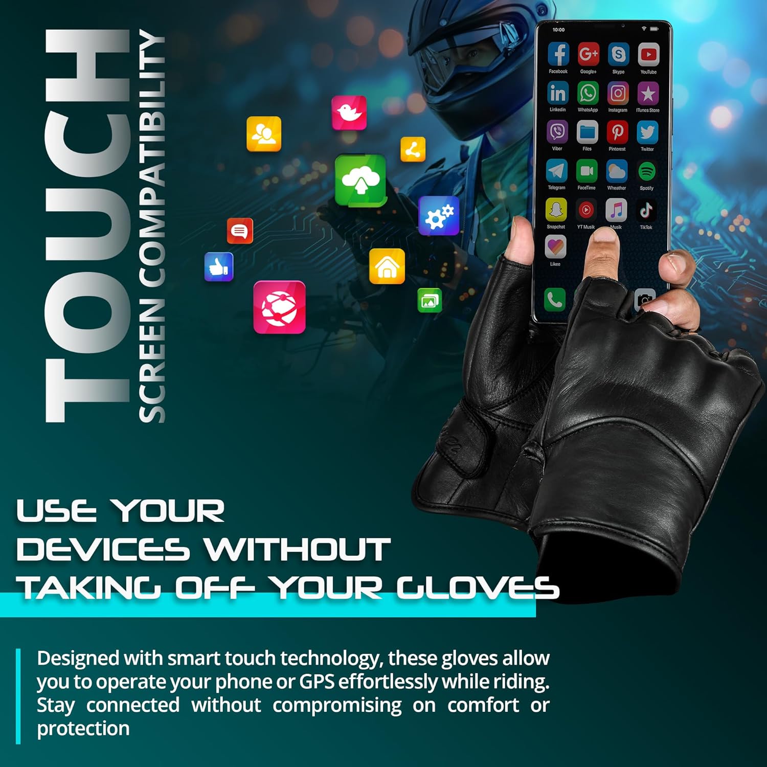 - TOUCHSCREEN MOTORCYCLE GLOVES - aaasportx Motorcycle Gloves Fingerless Fingerless for Men Touchscreen thumb and forefinger have touch screen capability. The gloves can be used with any number of touch screen devices without the user having to remove the glove. This makes them ideal for outdoor activities. Perfect choice for motorcycle riding, motorbike racing, scooter, driving, snowmobile, off-road, ATV, MTB, Powersports activities.
