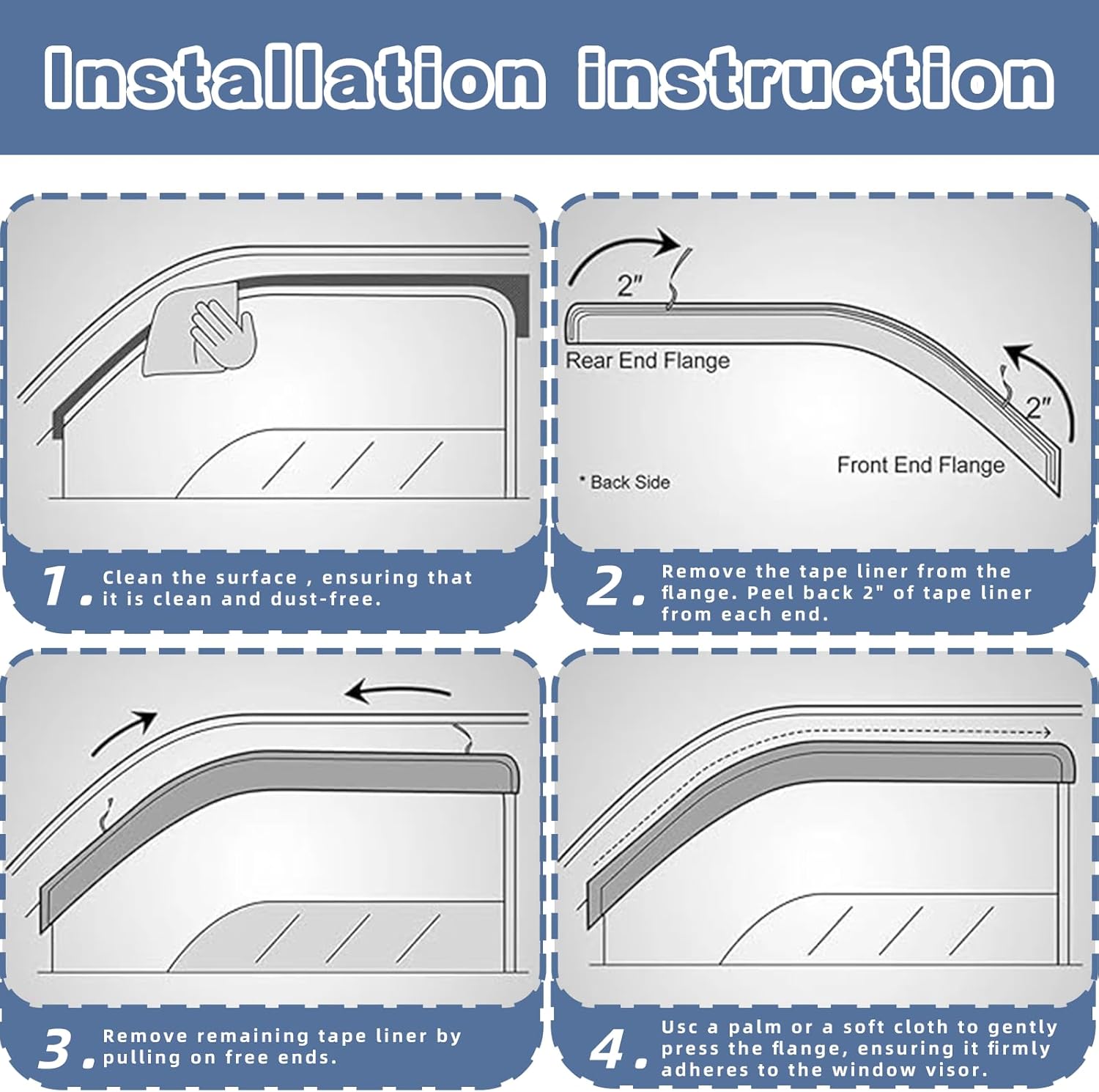 - ăInstallationă-No need for any drilling or special tool. Our Window Visors with tape for extra-strong grip, no drilling is needed ,and no disturbed in the windows up and down. [NOTE: Avoid washing your car for the first 24 hours after installation.]