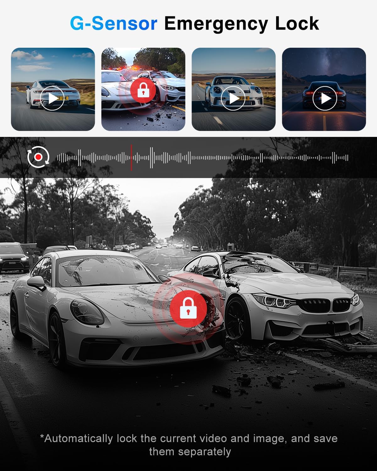 - ăLoop Recording & Gravity SensorăOur car dash cam has loop recording function. When the memory card reaches the storage limit(max up to 256G, we provide a 64GB card in the package), the dash cam will automatically overwrite the previous stored unlocked files. Once the G-sensor detects that the dash camera is impacted by physical or gravity, the current video file will be locked as an emergency file to prevent the video from being overwritten even in loop recording.