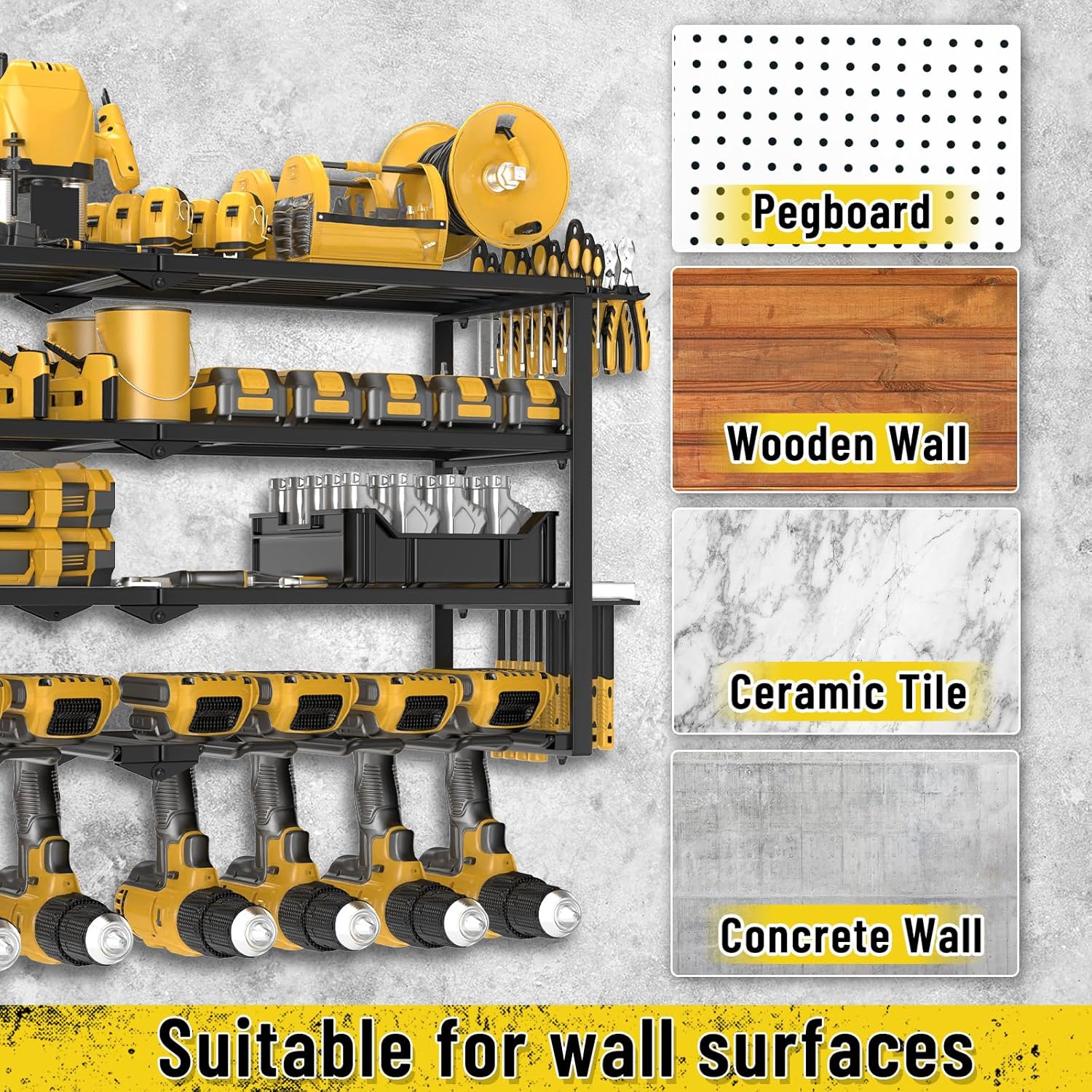 - DURABLE HEAVY-DUTY METAL CONSTRUCTION:This power tool storage rack is made from alloy steel. Its rust-resistant finish and sturdy frame provide exceptional durability and stability, it can hold up to 200 lbs without risk of detachment