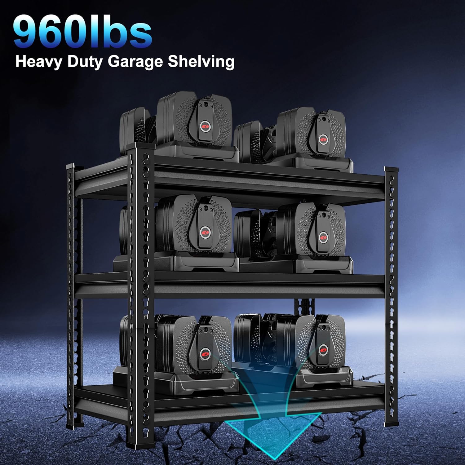 - ăLarge Loads Capacityă Made of all industrial grade metal, this 3-tier heavy-duty garage shelving holds 350 lbs each shelf and 1050 lbs in total. You're free to pile on tools, supplies, or whatever you need in your garage or warehouse