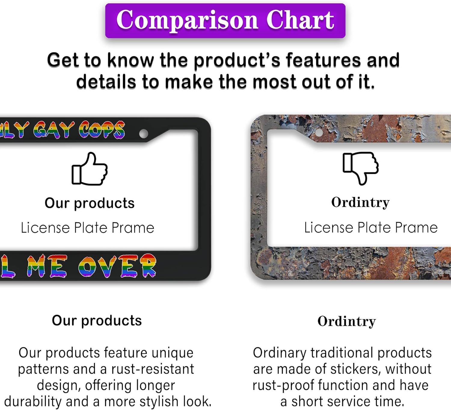 - FUNNY DESIGN: Featuring a unique and customized design, this license plate frame creates an eye-catching and bold statement for your vehicle. Not only does it add a touch of personality to your car, but it also makes for a great holiday gift, souvenir, or decorative piece for family, friends, and colleagues. Elevate your vehicle's style while sharing a laugh!