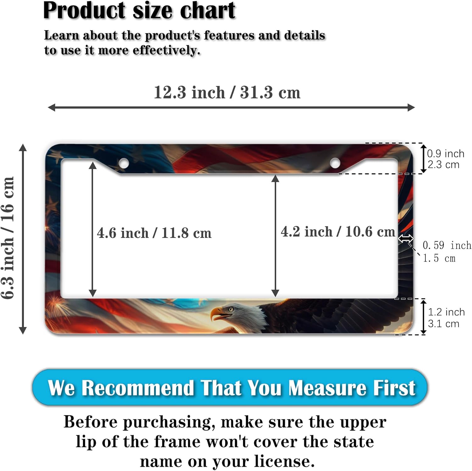 - STANDARD FRAME SIZE: Ensure a perfect fit by checking the dimensions to avoid covering your state name. These frames are specifically designed to fit standard American license plates measuring approximately 12.3" x 6.3" (16 x 31 cm). for most license plates in the U.S.