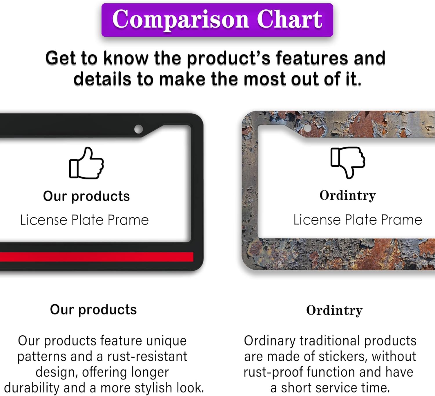 - ALUMINUM FRAME: This License Plate Frame is crafted from high-quality aluminum that is resistant to corrosion, rust, and harsh weather conditions. Its rugged reliability design ensures a long lifespan, making it capable of withstanding car washes and extreme weather, providing you with a reliable and stylish solution for your vehicle.