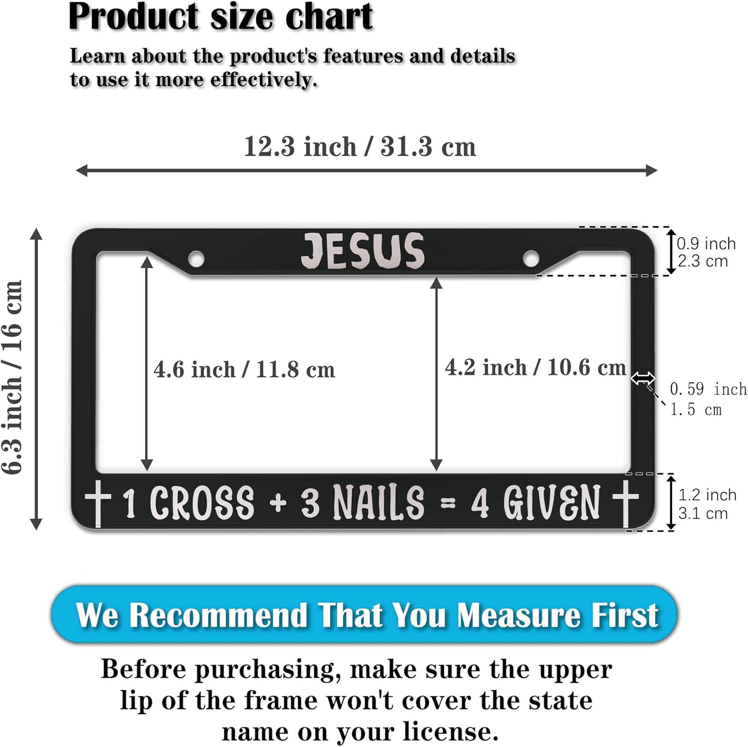 - STANDARD FRAME SIZE: Ensure a perfect fit by checking the dimensions to avoid covering your state name. These frames are specifically designed to fit standard American license plates measuring approximately 12.3" x 6.3" (16 x 31 cm). for most license plates in the U.S.