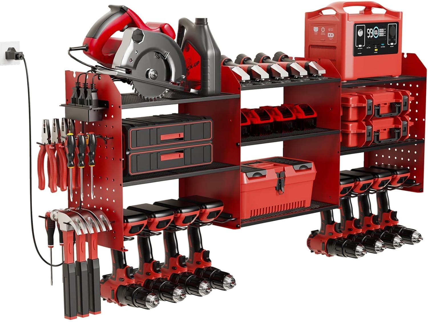 - Power Tool Organizer with Charging Station: Position outlets on either side to keep your tools charged. The American-standard power strip (Output: 125V/12A/1500W) provides device protection, frees up top-shelf space, and clearly displays power status. Includes a 6.56 ft power cord for easy setup