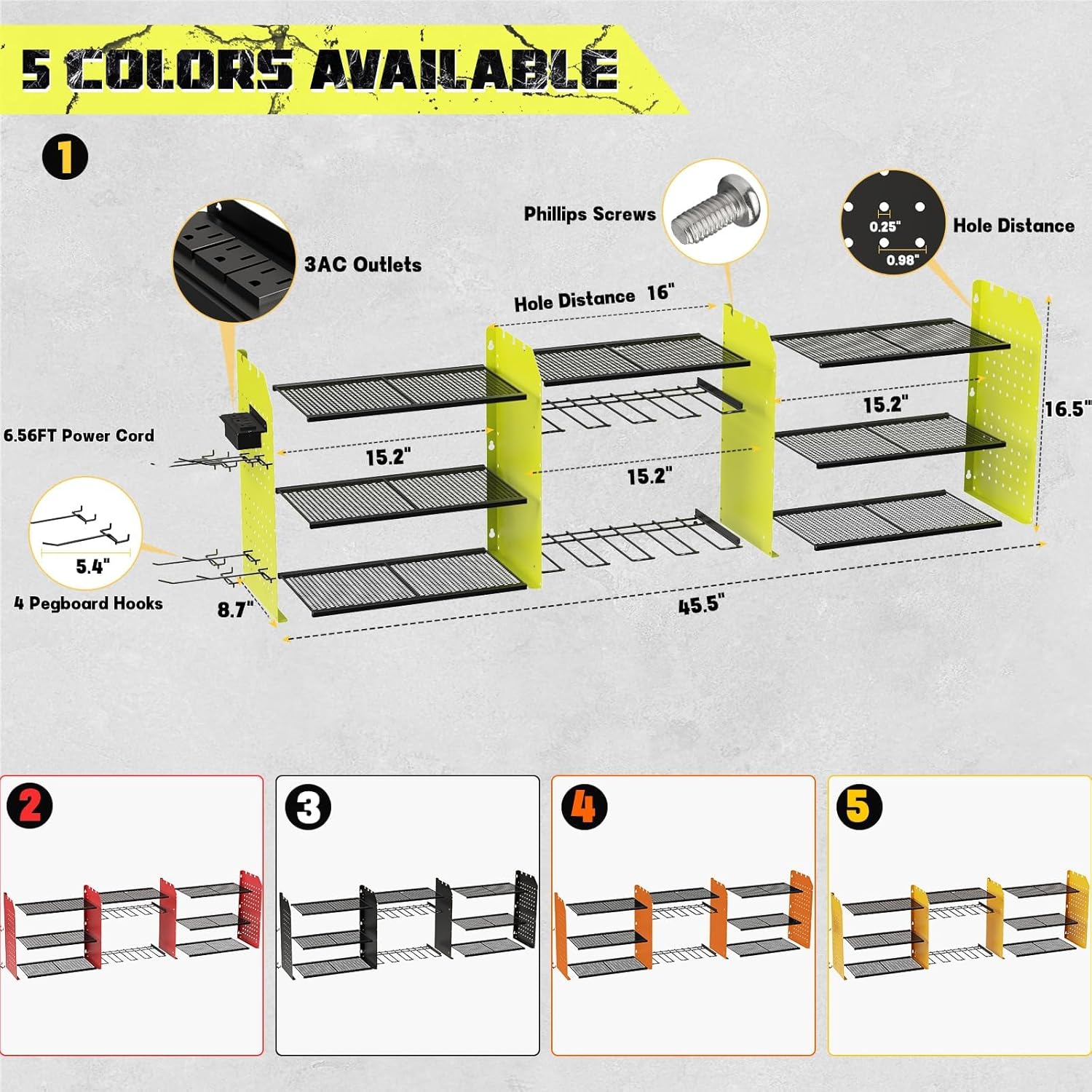 - Power Tool Organizer with Charging Station: Position outlets on either side to keep your tools charged. The American-standard power strip (Output: 125V/12A/1500W) provides device protection, frees up top-shelf space, and clearly displays power status. Includes a 6.56 ft power cord for easy setup