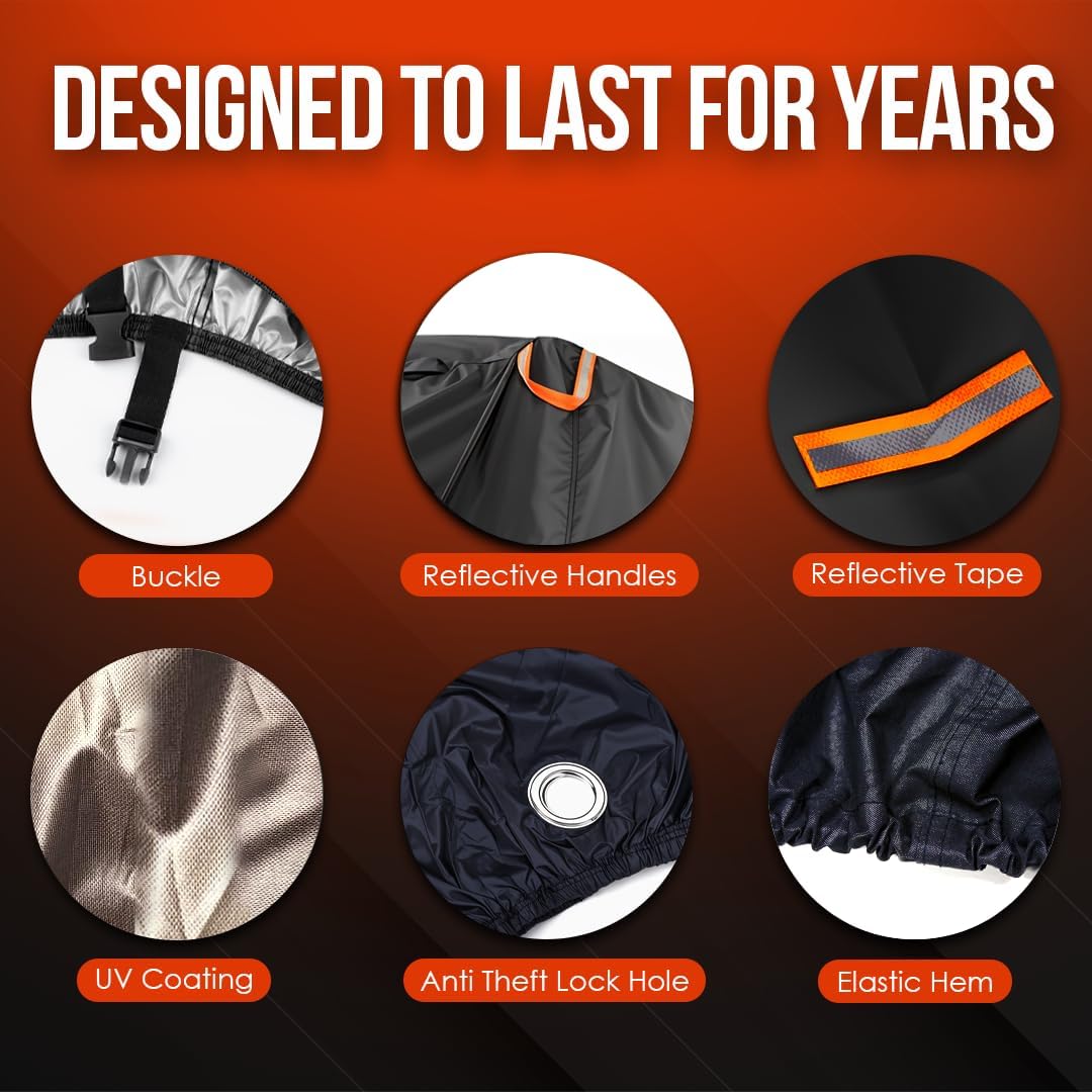 - Coverage : Full exterior coverage for Motorcycle, Scooter, Bicycle