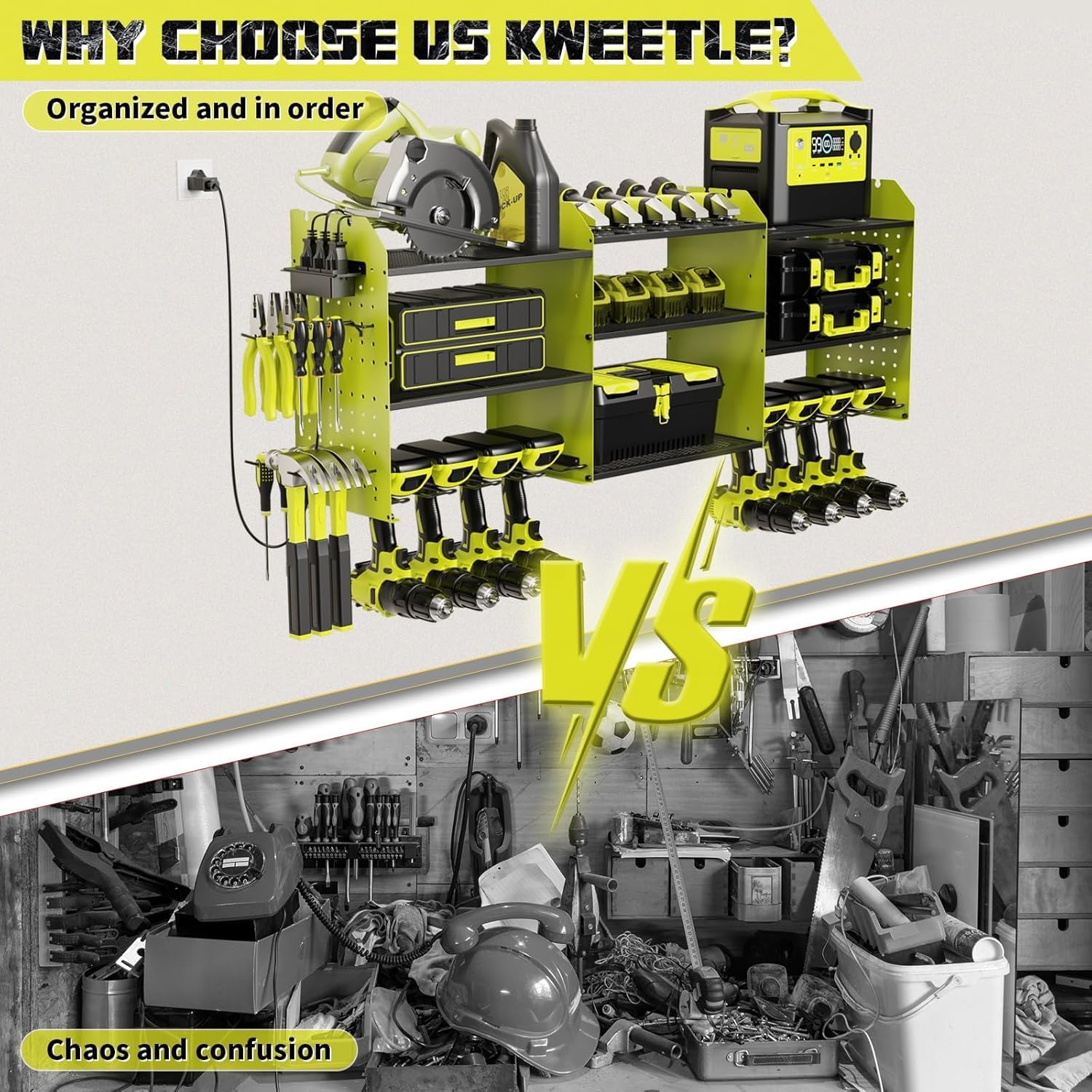 - 【EXCELLENT MATERIAL】This power tool organizer is made of thickened, heavy-duty steel metal with a durable black powder coat finish to prevent rust, it will stay in brand new condition whether it's in a wet basement or dusty and humid garage, ensuring that the tool rack will have a lifetime of service life and become a reliable companion in your workplace.