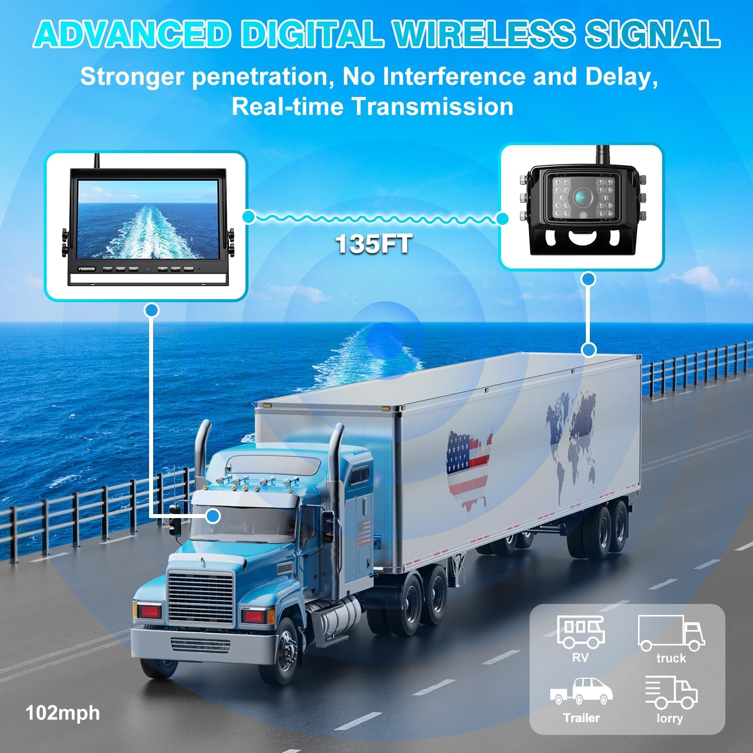 - ăAdvanced Digital Wireless Signal TechăThe system has a stable digital signal technology that works up to 128 feet in open areas and is enough for any large vehicles. Even at speeds up to 102mph, the monitor will show you what's going on around you in real time, making your driving easier. No interference, flicker, blur or delay.