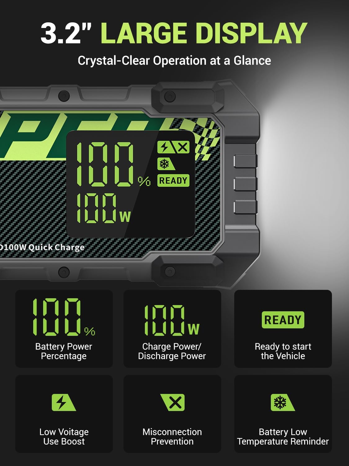 - [3.2-Inch Display & 3 Modes Lighting]- This jump box features a clear 3.2-inch display for real-time battery monitoring. It also includes a 400-lumen LED light with three modesâsteady lighting, strobe, and SOSâfor versatile use in any situation