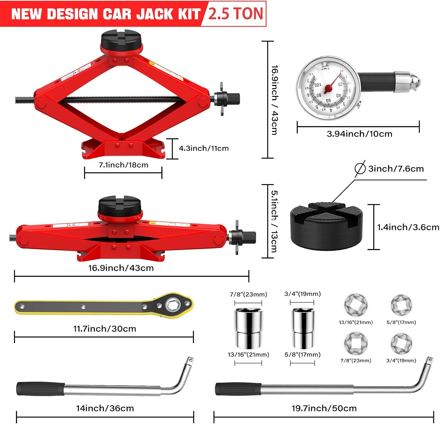 - ăComplete Tire Changing Kită2.5T Scissor jack x 1; Rubber Pad x 2 ; Ratchet Wrenchx 1; Lug Wrench x 1; Pressure Gauge x 1; Storage Bag x 1.he all-inclusive kit fits perfectly in your trunk or garage, ready to tackle any emergency tire replacement job.