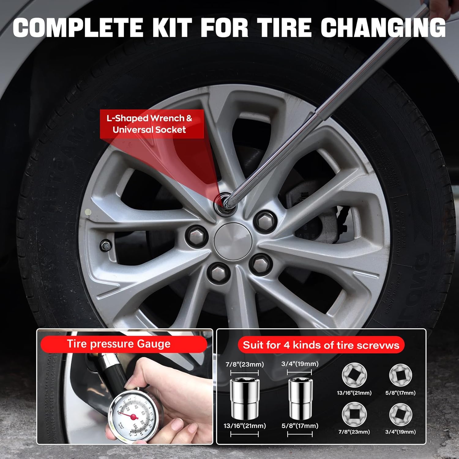 - ăUniversal Car Emergency KităThis car jack set is universally compatible with Sedans, SUVs, MPVs, and other vehicles. It is perfect for emergency situations where you need to change a flat tire, remove a stuck wheel, or perform other vehicle repairs.Plus, its compact size makes it easy to store in your trunk or backseat.