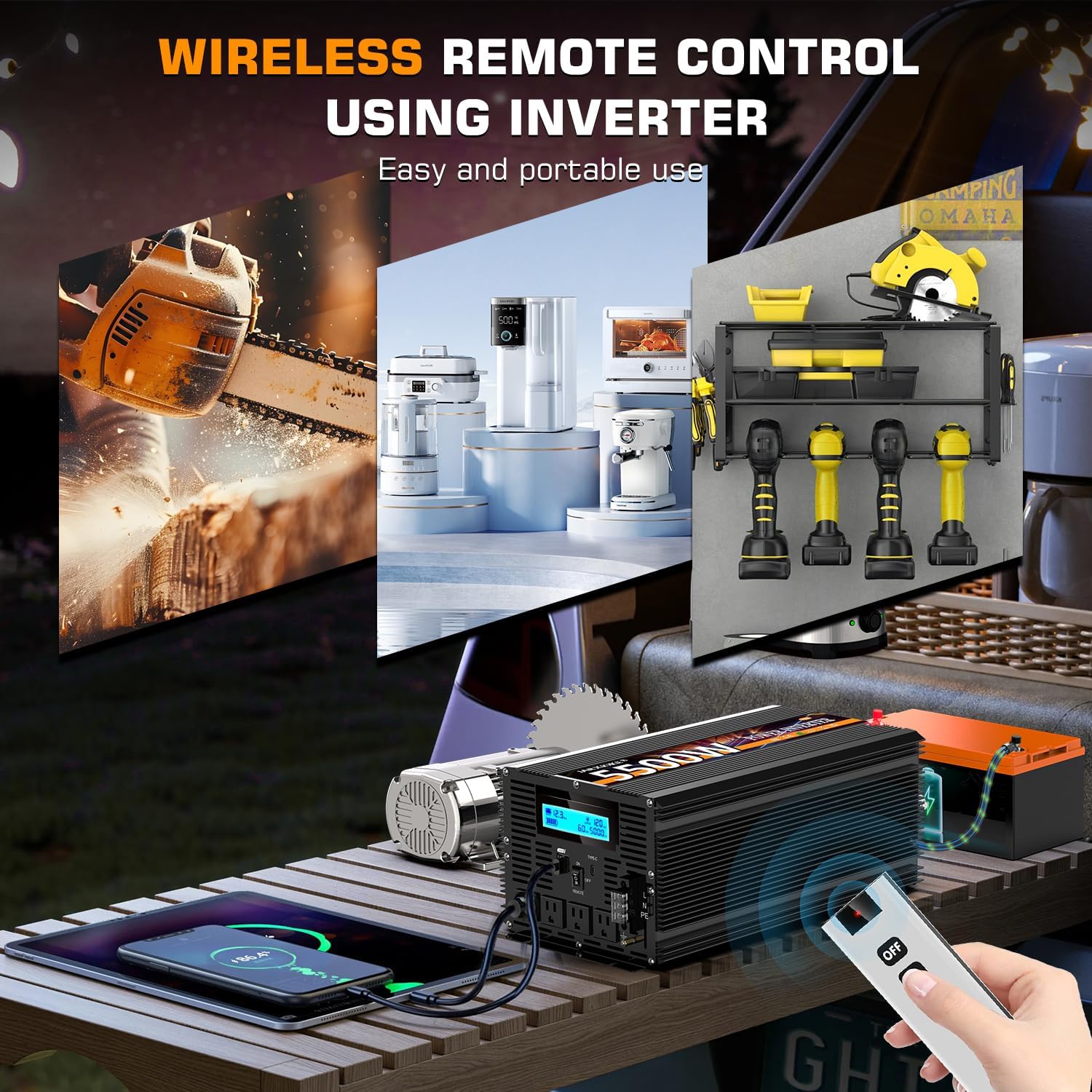 - ☀ This is a 12 volt 5500 watt modified wave inverter that converts DC 12v to AC 110V/120V. Perfect for traveling, camping, tents, boat trips, working on the road, and anywhere without electricity! Just connect the power inverter to the battery and then to the device.