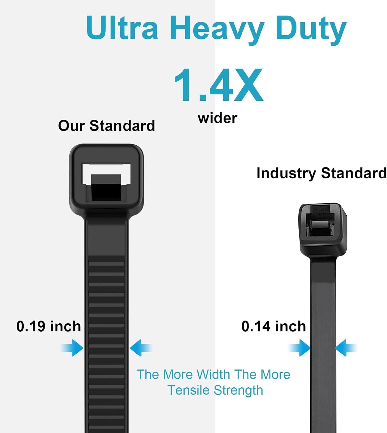 - 【100lb Tensile Strength】: The more width and Thickness, the more tensile strength. our zip ties 12 inch width is 0.19 inch(4.8mm), while industry standard is 0.14 inch(3.6mm), our zip ties 12 inch Thickness is 0.065" inch(1.65 mm), while industry standard is 0.05 inch(1.25mm),more tensile strength.