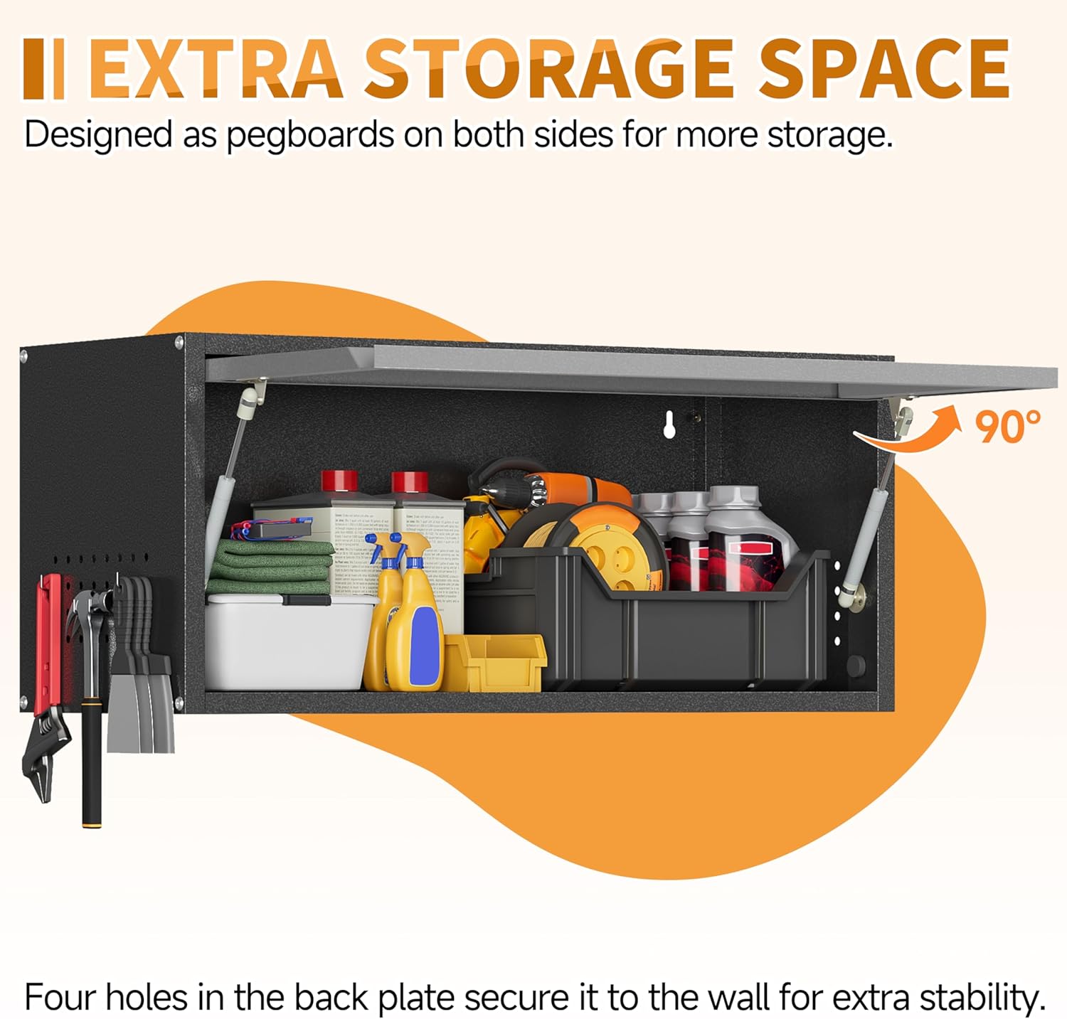 - ăSafely On The WallăFirstsky Garage Wall Cabinet is made of high quality materials, carefully designed and rigorously tested to ensure a solid structure, capable of storing heavy objects without warping. There are four holes on the back panel to secure it to the wall for extra stability. Up to 120 pounds weight capacity allows you to store any item you want. Compared to other cabinets, you can hang more tools on the sides while it remains stable.