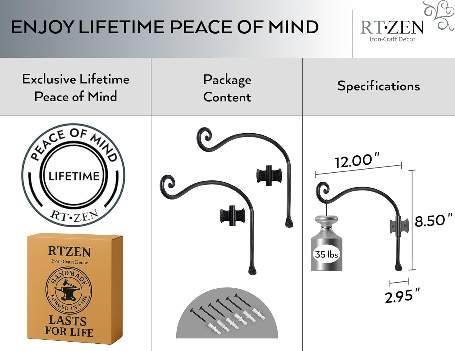 RTZEN Plant Hangers Outdoor or Indoor - Wrought Iron Metal Hanger Indoor Hook - Heavy Duty Wall Bracket Hooks for Hanging Plants Baskets Lanterns Wind Chimes - 2 Pack (Black Axe-Shape Hooks)
