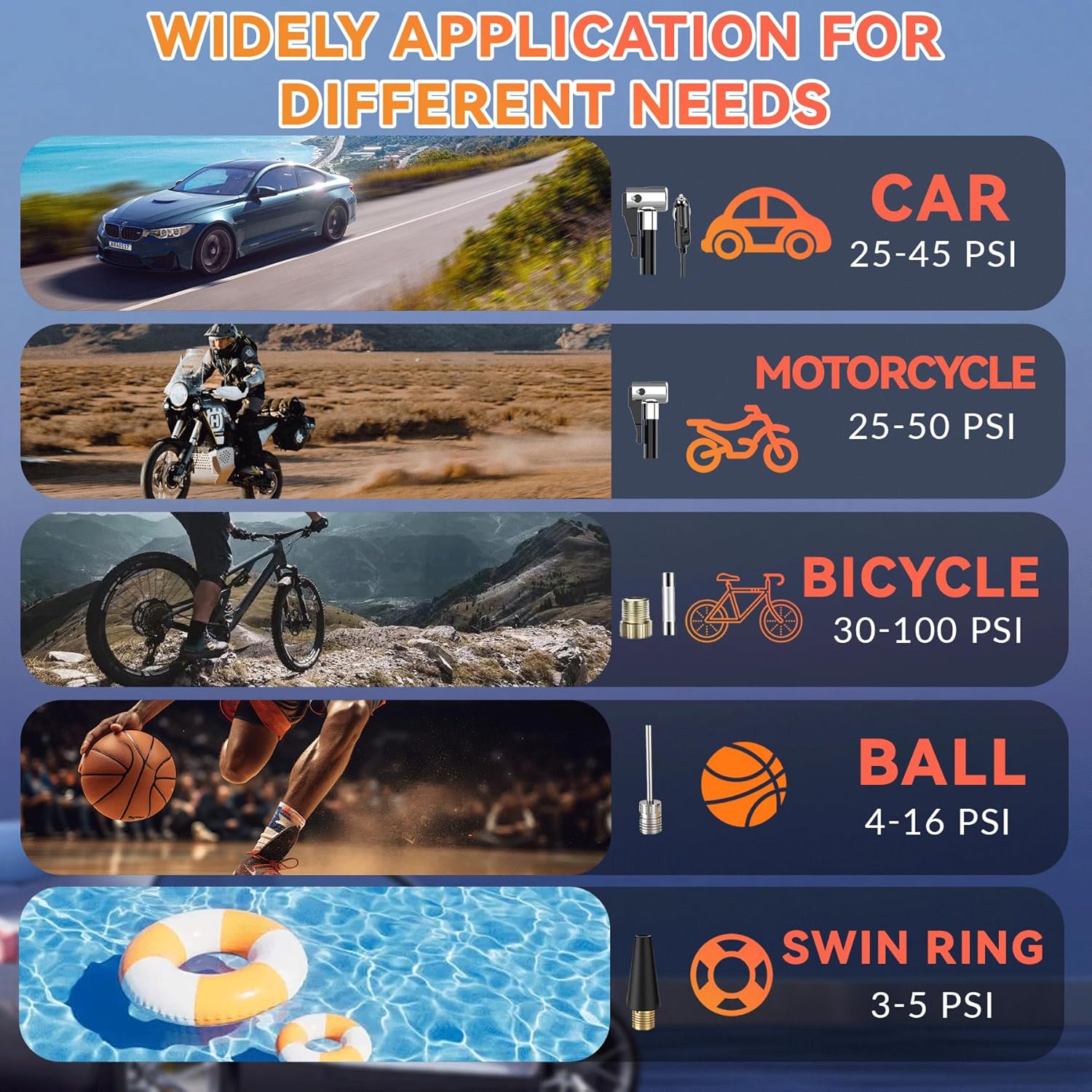- 3X Fast Inflation: Tire inflator portable air compressor has powerful motor,providing a maximum pressure of 150 PS and airflow 36L/Mi,can inflates small car tires from 30 psi to 36 psi in less than 1 minute and offers 4 preset inflation modes (Cars, Motorcycles, Bikes, and balls ) to meet various inflation needs