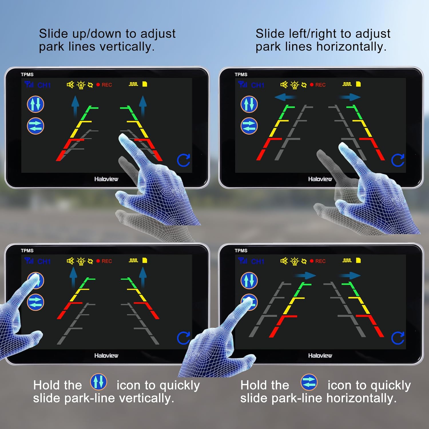 - Real-Time Tire Pressure Display on Camera View: Real-time tire pressure and temperature readings data are displayed directly in the camera views. The display will automatically cycle through the displayed tires data one by one every 5 seconds, allowing you to view each tire data without switching TPMS menu. Additionally, the TPMS readings can be Enabled/Disabled, and its overlay transparency is adjustable, allowing you to customize the display to avoid obstructing your camera’s field of vision.