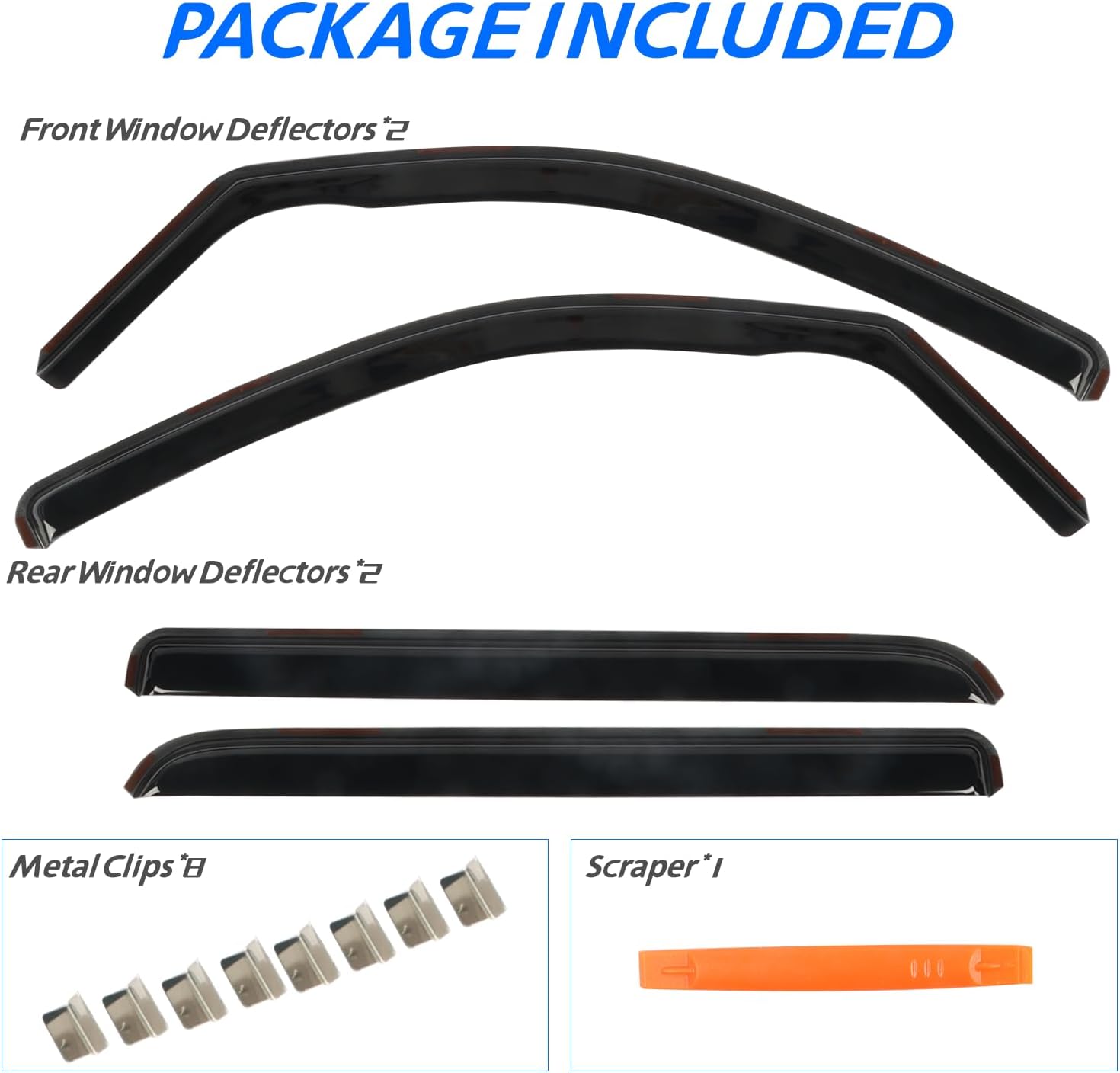 - ăEasy Installationă Come with 4 pcs FULL-SIZE side window deflectors, 8 pcs clips, 1 pcs plastic Crowbar for a durable and secure installation. No complicated instructions are needed. Attention: Please apply the clip to fix the rain guards