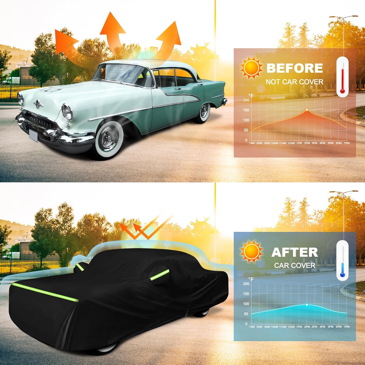- ăDesigns of Car Coveră(1) Black Coating: UV protection and heat-proof,prevent cracking and aging of inner decoration leather and plastic. (2)5 Reflective Strips attached on the front DRL lamps, middle Turning lights and Rear taillight to prevent collisions during the night.(3)Mirror Pocket: All-around protection of the rearview mirror.(4) The cab side has a zipper for temporary access.