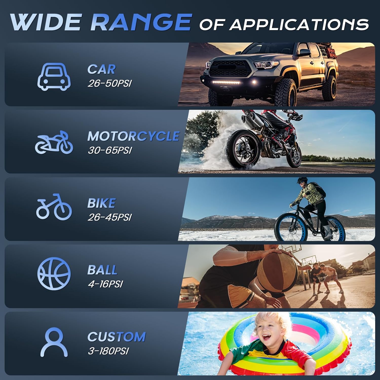 - โค๐๐๐ ๐๐๐, ๐๐ ๐ ๐๐ฌ๐ญ ๐๐ง๐๐ฅ๐๐ญ๐ข๐จ๐ง ๐๐ฉ๐๐๐: The AIPOWAY air compressor portable provides a maximum pressure of 180 PSI and an air flow of 32 L/min. It can fully inflate car tyres in 6-9 minutes, motorcycle tyres in 2 minutes, bicycle tyres in 65 seconds and various balls in 50 seconds. You only need to switch to the appropriate inflation mode, and, after inflation is complete, it automatically stops to prevent over inflating.