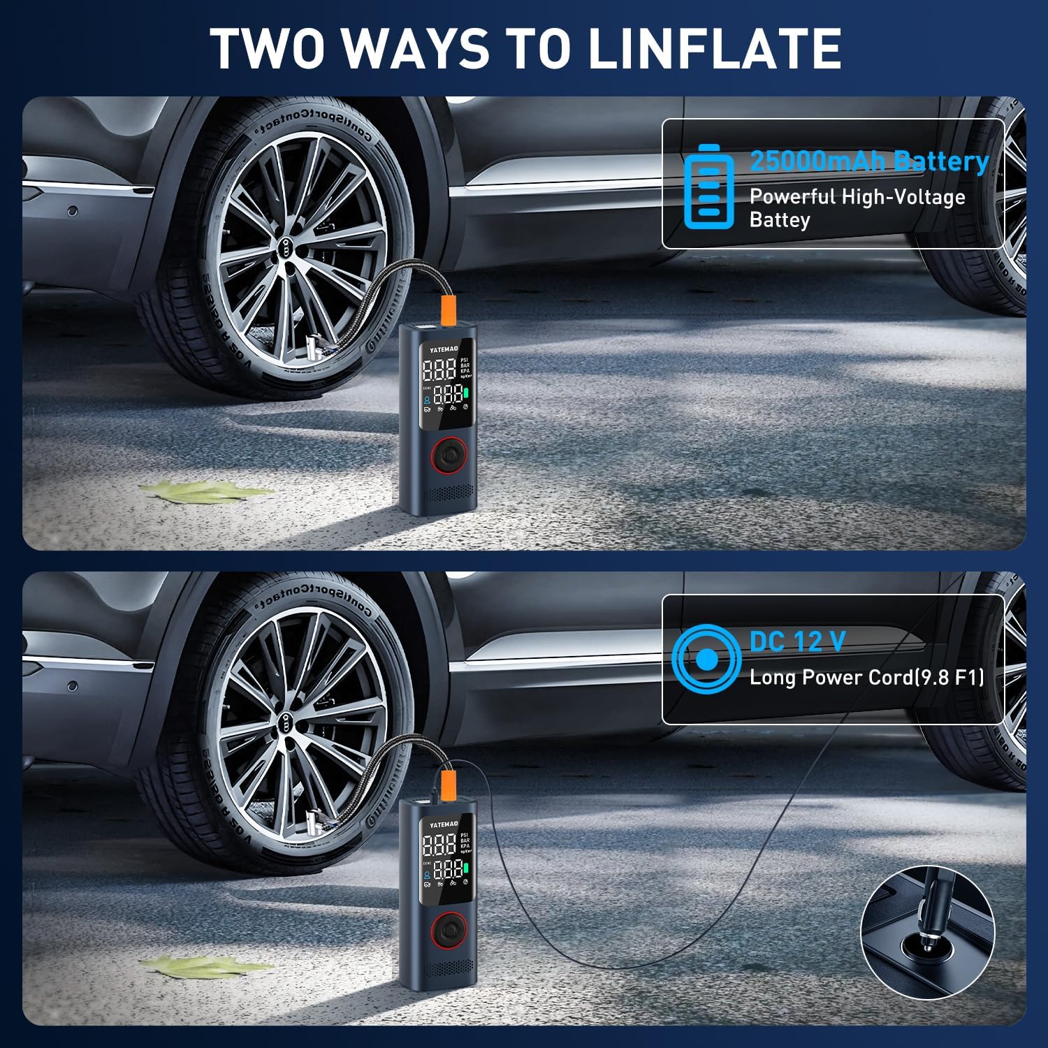 - 【Powerful and Versatile Tire inflator portable air compressor】 Equipped with 25,000mAh capacity, the portable tire inflator for car lasts for 1-2 hours of continuous use and can be fully charged in just 3-5 hours, and the car tire air pump portable can be used in two ways, either wirelessly or using the car cord to inflate when the battery runs out.