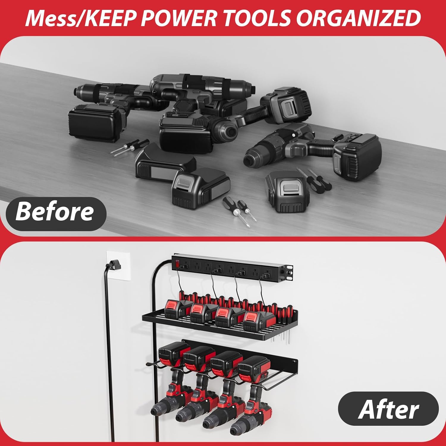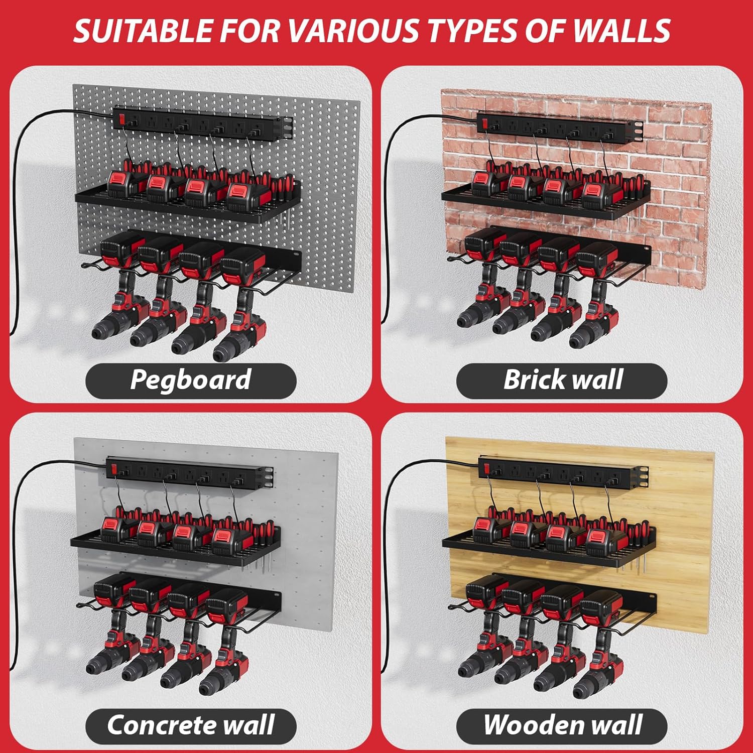 - 【Easy to Install】This cordless tool organizer is very easy to mount on the wal. Use the expansion screws and bolts to install the tool organizers in 3 minutes.It can be mounted on a wooden wall, brick wall, concrete surface, or pegboard.