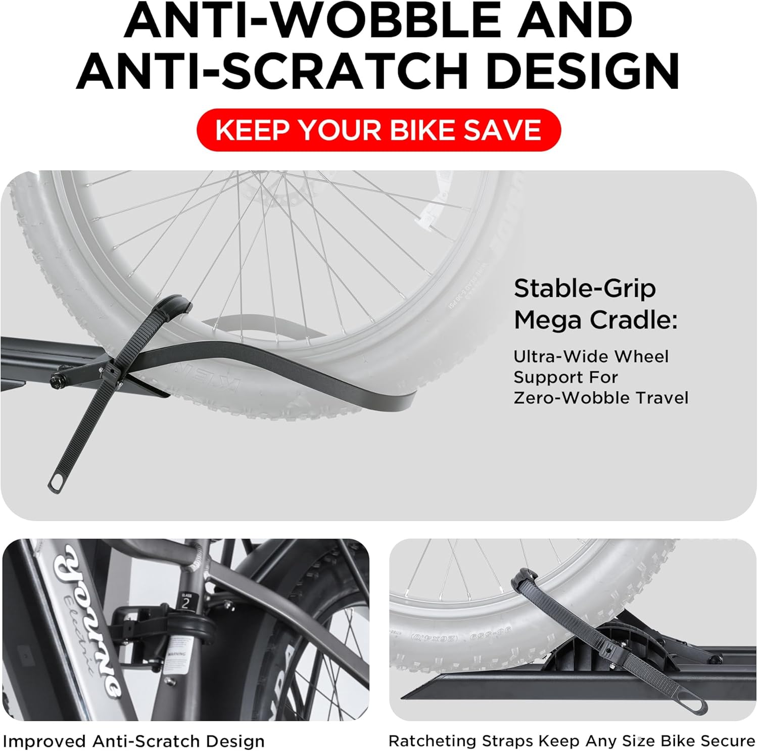 - 200 LB TOTAL CAPACITY: Easily transports up to 100 pounds per bike. Universal tire holders and wheel straps are compatible with e-bikes, mountain bikes, road bikes with up to 5” fat tires.