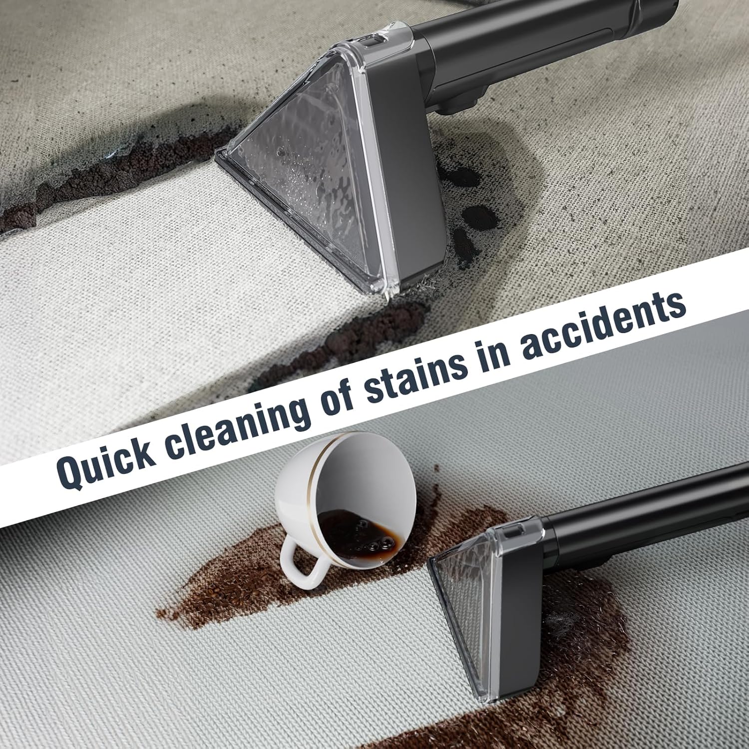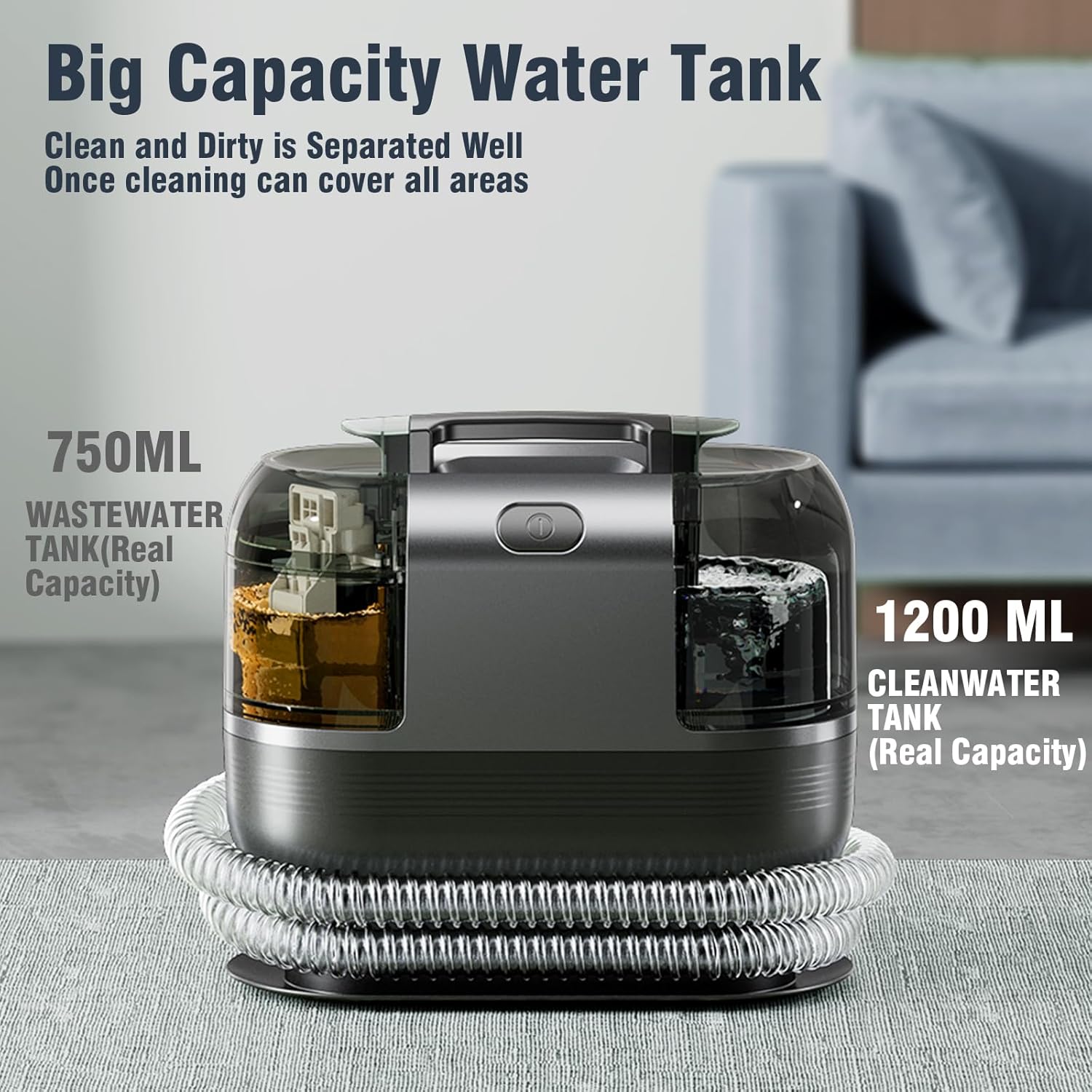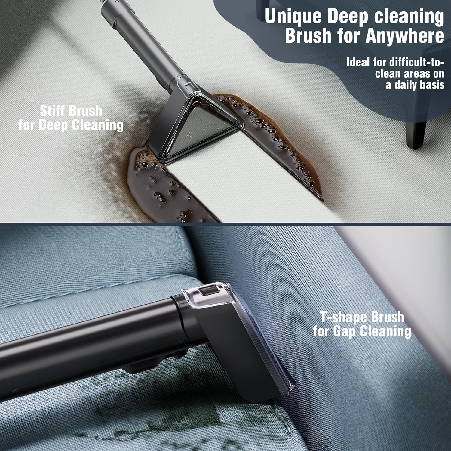 - 【DUAL WATER TANK & BRUSH HEAD】0.75L sewage tank and 1.20L clean water tank are stored separately, allowing you to easily disassemble the water tank for filling, draining, and cleaning. Tips: The water volume of the dirty tank can't exceed the MAX line, otherwise it may cause the suction of the couch cleaner to stop. The upholstery cleaner machine is equipped with two sizes of brush heads, which can be used for stains in different areas.