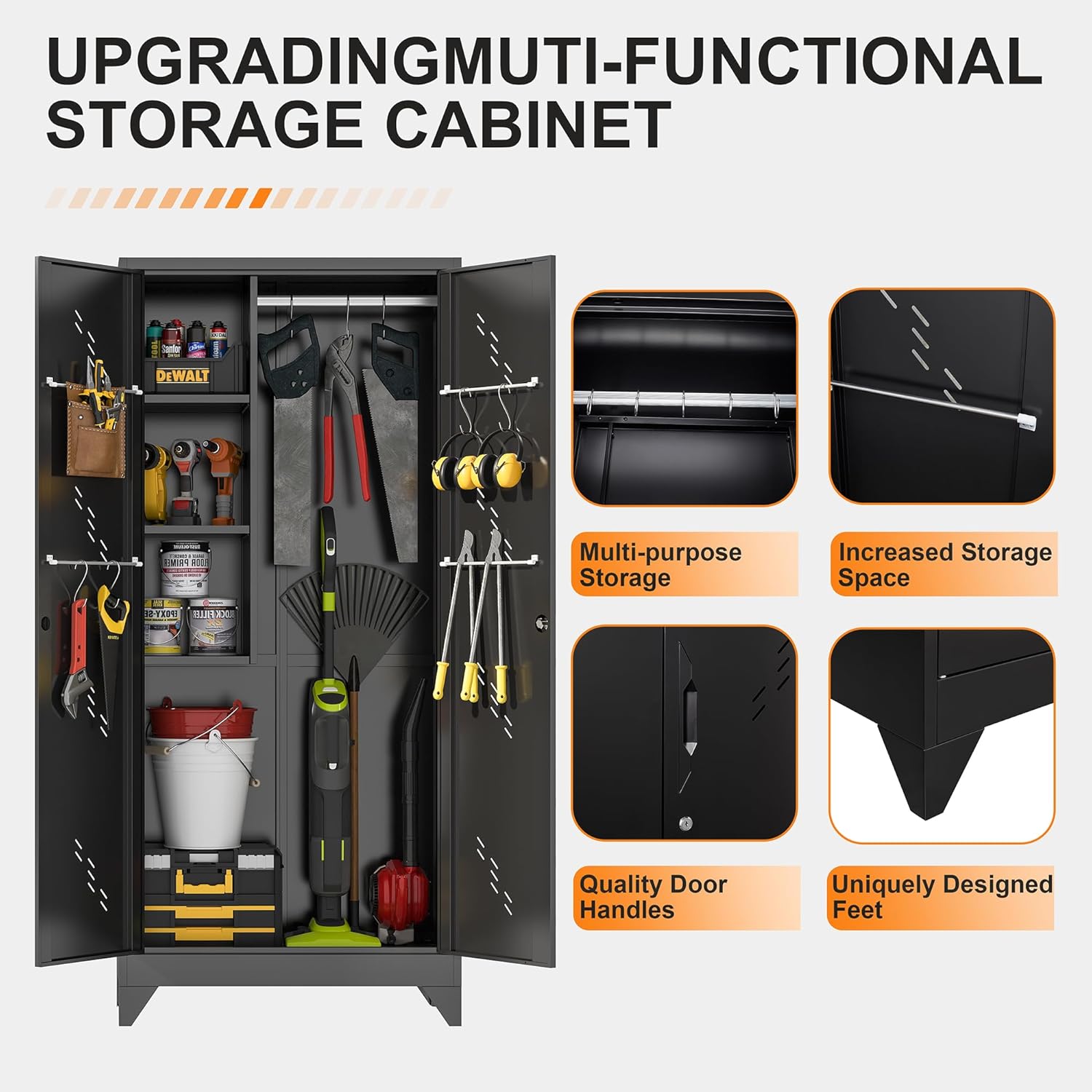 75" Metal Storage Cabinet, Tall Broom Cabinet, Garage Cabinets with Locking Doors, Black Outdoor Utility Broom Closet Storage Cabinets for Office, Bathroom, Warehouses