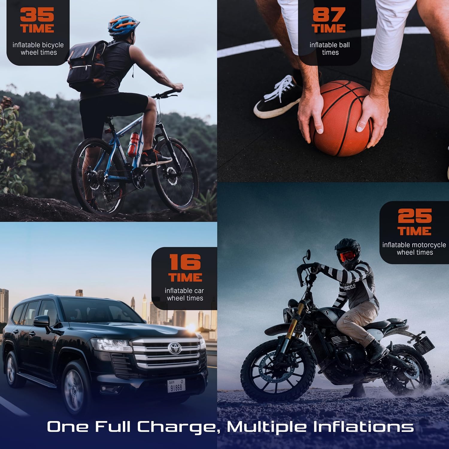 - Multiple Uses Beyond Car Tires – In addition to car, truck, and motorcycle tires, this multi-functional air compressor can inflate sports balls, bicycles, pool inflatables, and more. The OQTER Tire Inflator is compatible with various inflatable products, making it a versatile tool for any outdoor activity or sports enthusiast.