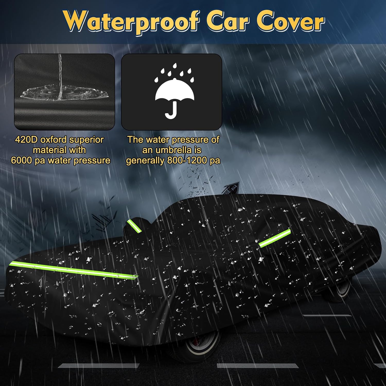 - ăAll-Weather ProtectionăMade black 420D Oxford cloth and multi-layer waterproof fabric as material, ensuring its quality is tough, durable, and safe in strong wind conditions. Protects your vehicle and paint from rain, snow, sun, bird droppings, pollen, dust/dirt - suitable for all seasons.