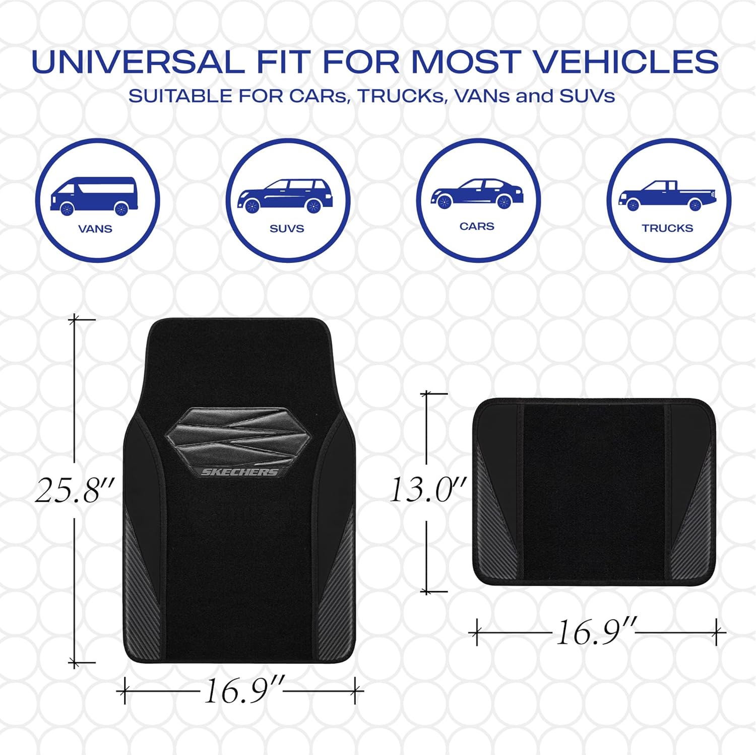 - UNIVERSAL FIT-Skechers car mats Designed to fit most SUVs,vans,sedans,and trucks, This full set includes 4 floor mats,Front piece: 25.8×16.9 inches,Back piece: 11.4×16.1 inches, providing comprehensive coverage for both front and rear seats, giving your entire vehicle floor the protection it needs.Perfect gift for family, relatives and friends