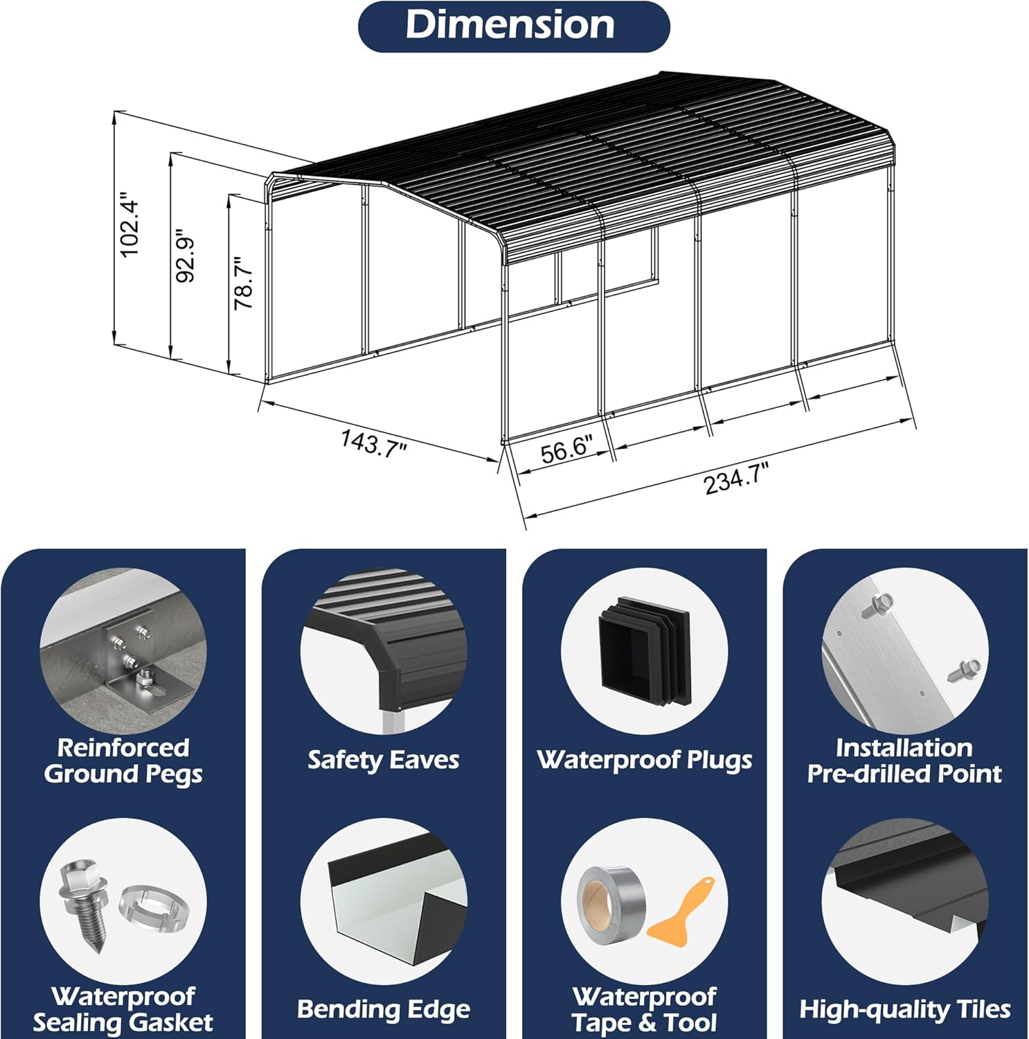 - 【More Upgraded Features】Safety eaves are installed at the front and rear of the carport, enhancing both aesthetics and roof safety. The carport base is reinforced with anchor bolts and thick steel plates, securely linking it to the ground. Waterproof plugs are fitted to the tubes frame to minimize ground water penetration