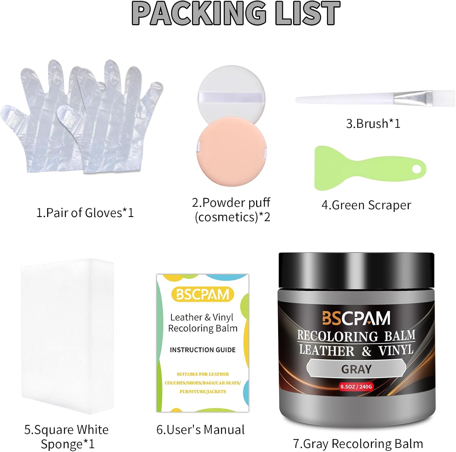 - Easy DIY Repairs: Leather repair kit includes, 1 Recoloring Balm + 1 Sponges + 2 Gloves + 2 Powder Puff + 1 Brush + 1 Putty Knife + User's Manual,meet any leather repair project
