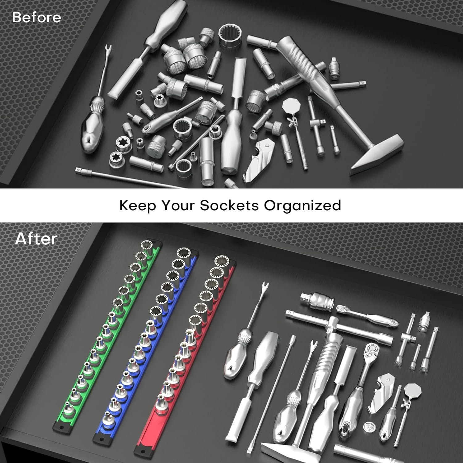 - 【Versatile Applications】 Designed with a strong magnetic back, our socket set organizer easily attaches to any metal surface, can be wall-mounted, or placed in tool cart drawers, providing versatile storage solutions for your workshop or garage.